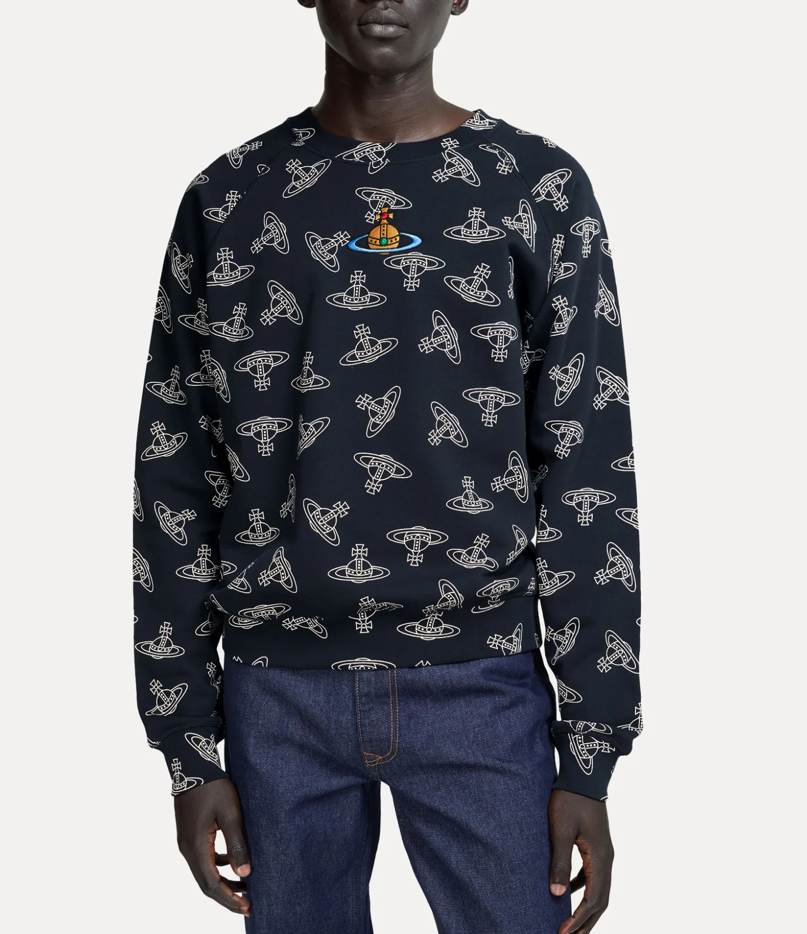 The signature Raglan sweatshirt draws inspiration from the house’s archive, showcasing an orb jacquard pattern across the design and a vibrant multicoloured orb embroidery at the center. This iconic detail embodies Vivienne’s innovative blend of tradition and modernity.