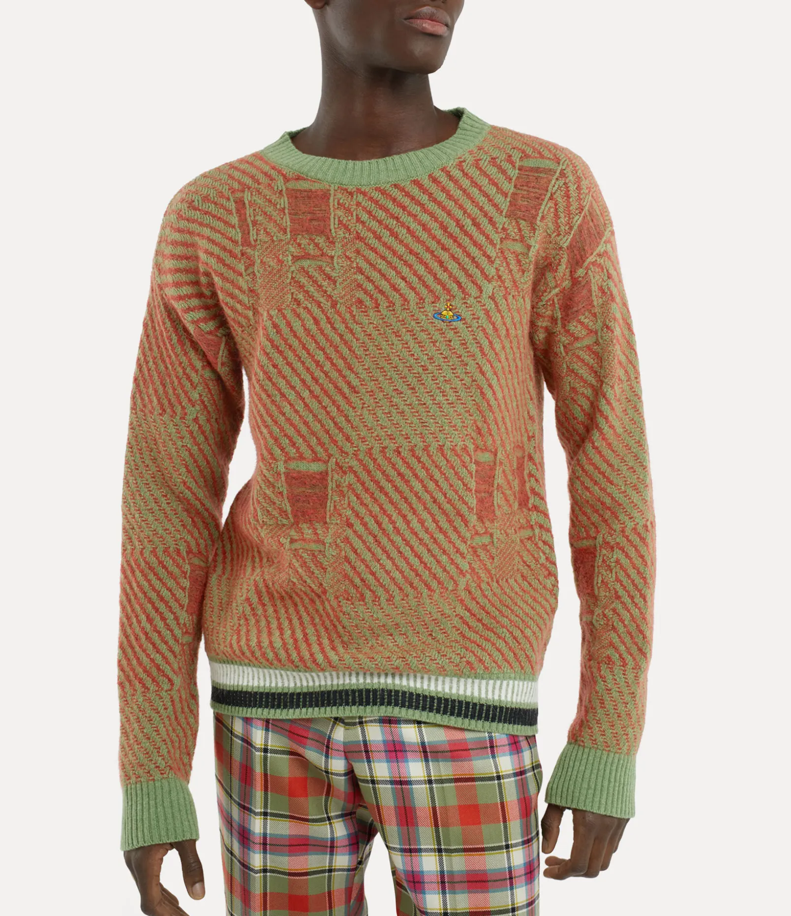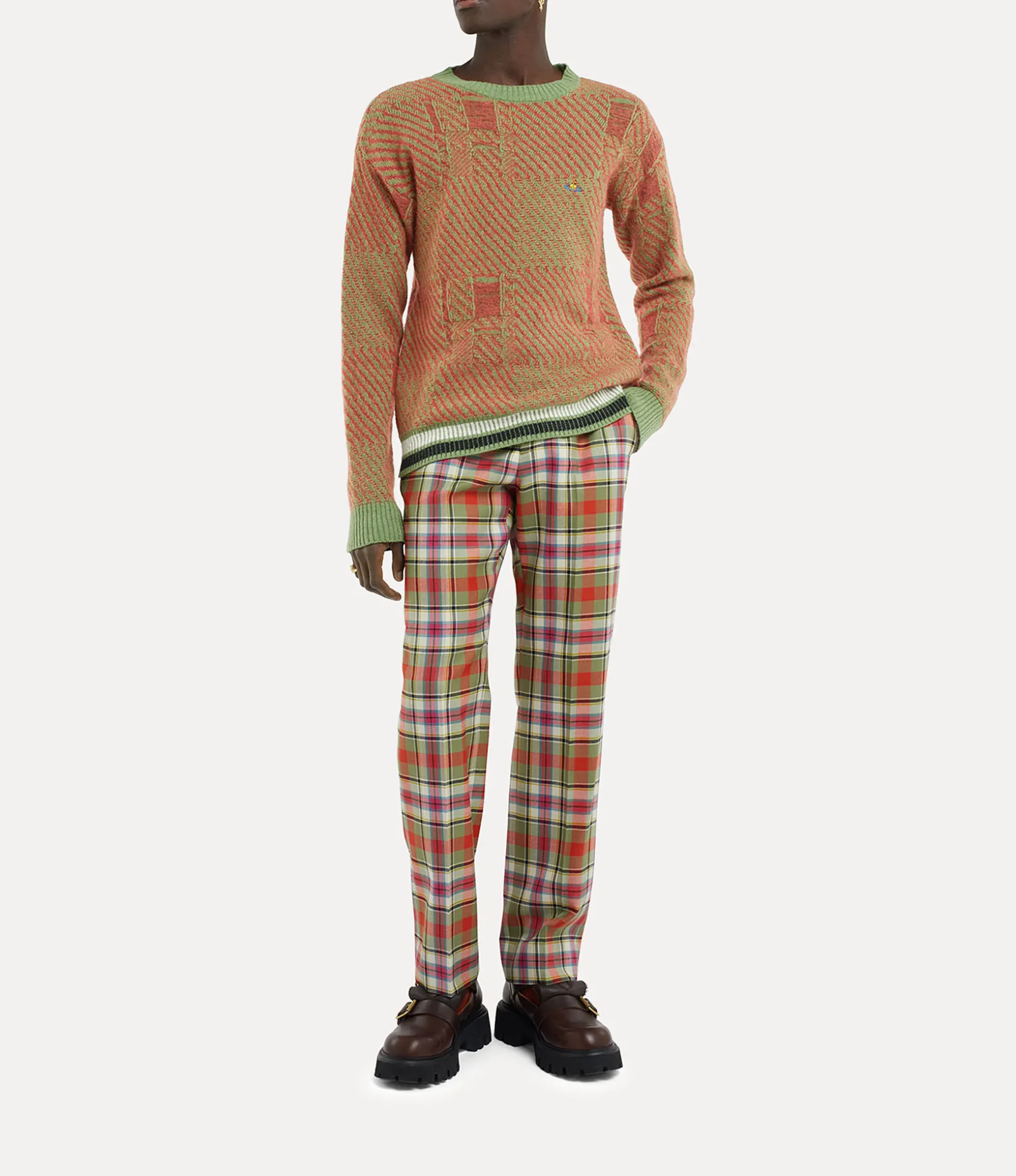 Our Highlander jumper adopts a soft silhouette with a multicoloured orb embroidery on the left-hand side of the chest – synonymous with Vivienne’s vision of launching tradition into the future. The piece features contrasting ribbed details on the trims, complete with a magnified all-over tartan knit jacquard, reflecting the Highlands theme of this season’s collection.
