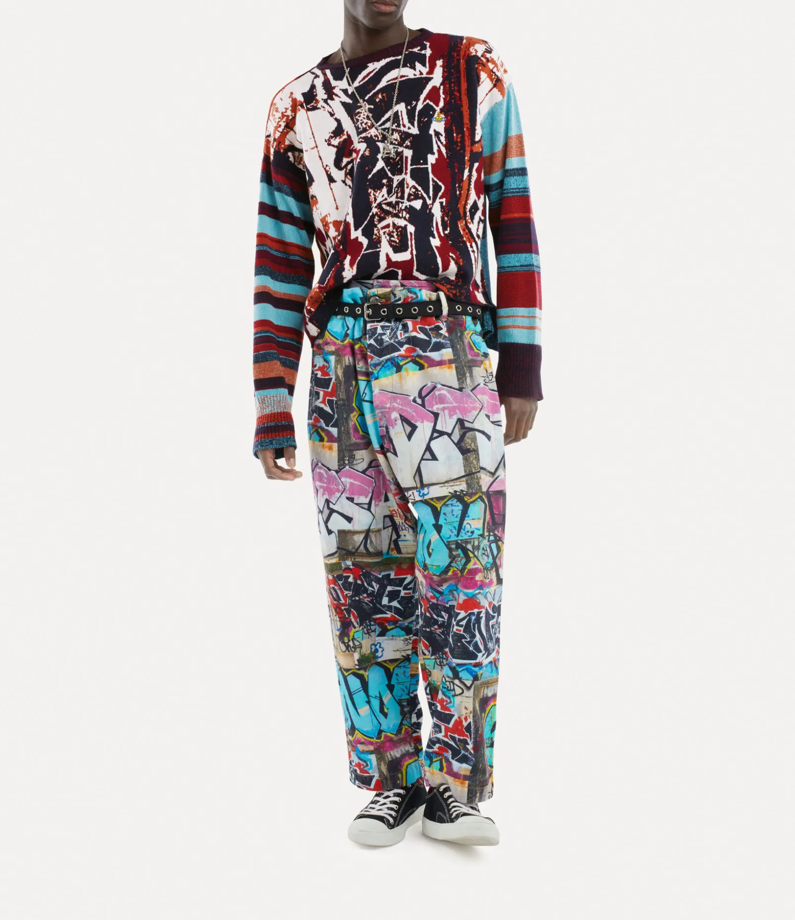 Our Graffiti jumper revives our timeless graffiti jacquard, first seen in the Andreas Kronthaler for Vivienne Westwood Autumn-Winter 2020-21 Paris show. This statement piece features our stripped TV-stitch details from the archives, reminiscent of the zig-zag patterns found on a distorted TV screen.