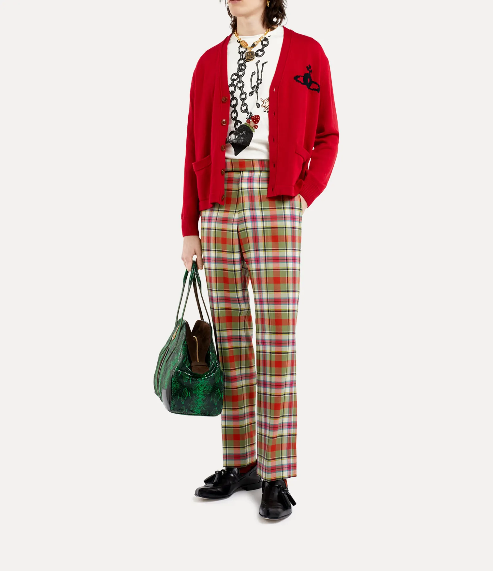 The Alex cardigan has become a signature style of the house and forms part of our classic collection. This season, the piece receives our signature amber button fastenings, complete with ribbed trims and a V-neck silhouette. As part of our new range, an intarsia orb is knitted on the left-hand side of the chest in a contrasting thread – synonymous with Vivienne’s vision of launching tradition into the future.