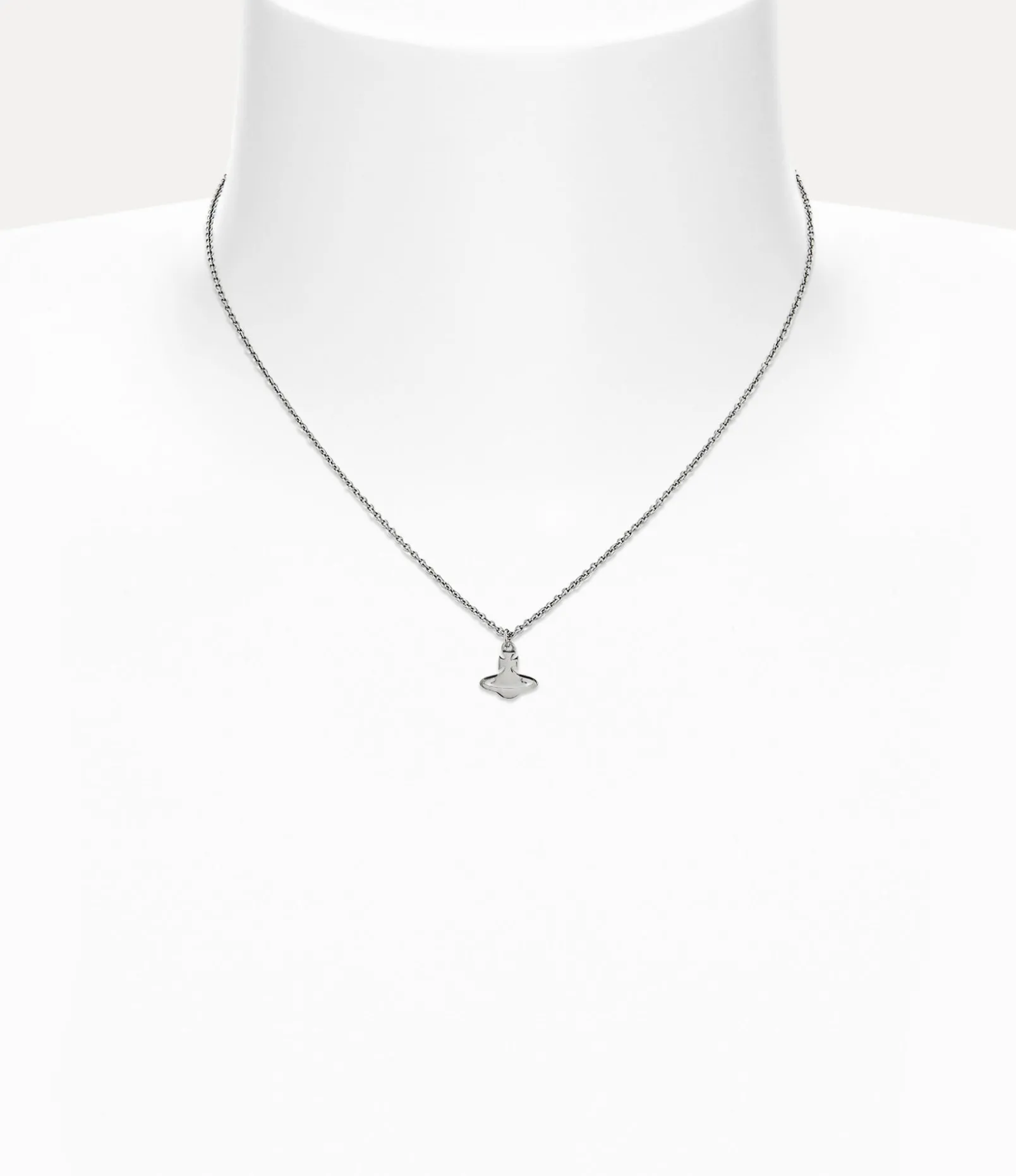 Our Carmen Pendant necklace features a platinum-tone silver finish, complete with a two-dimensional orb silhouette, representing Vivienne Westwood’s vision of launching tradition into the future. The piece receives a trace chain, which secures with lobster-clasp fastening at the back.