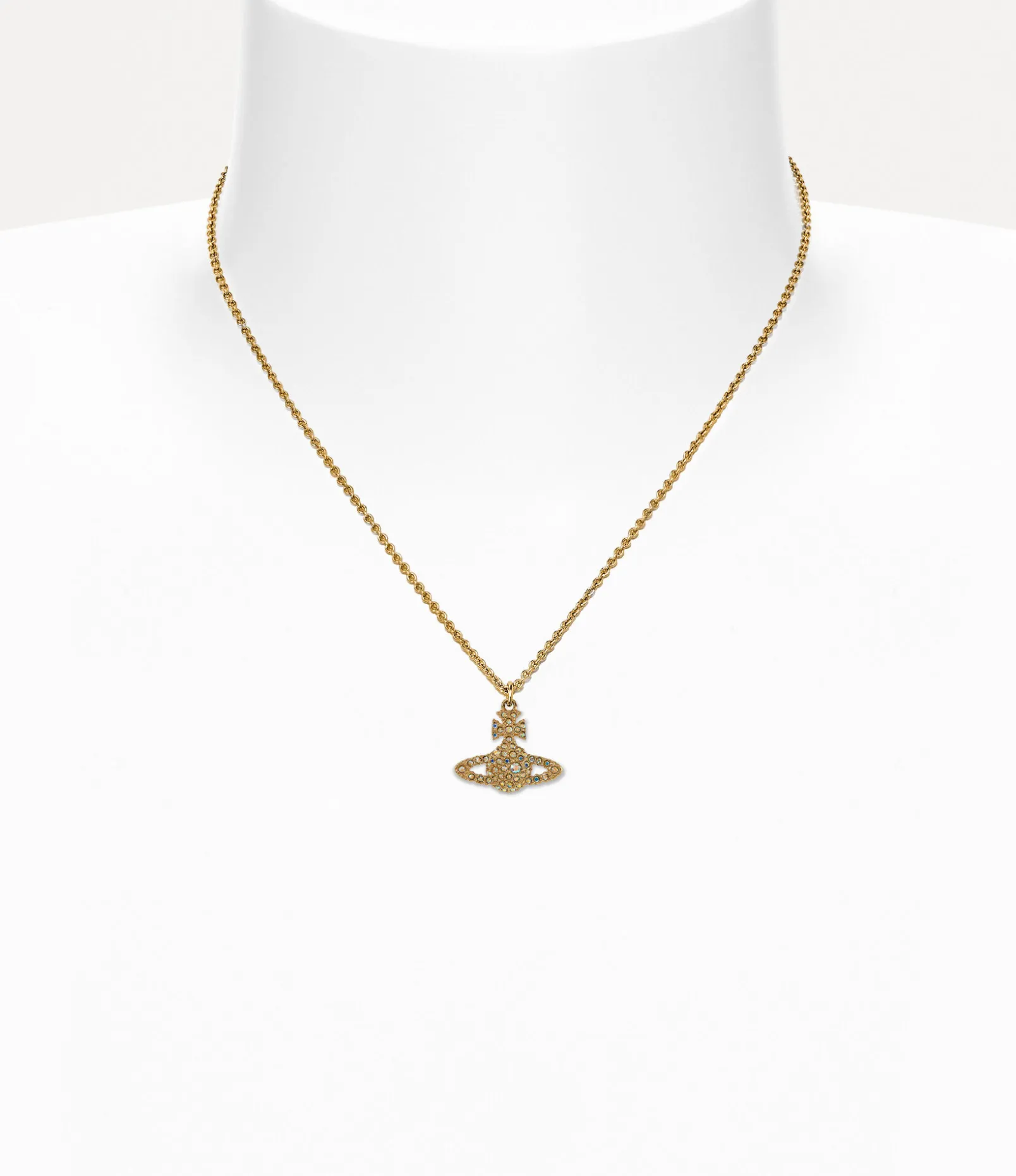 In homage to Vivienne’s vision of launching tradition into the future, the Grace Bas Relief Pendant necklace showcases a two-dimensional orb motif at its center. The design receives a surface of iridescent crystals decorating the silhouette, complete with polished, gold-tone plating to finish.