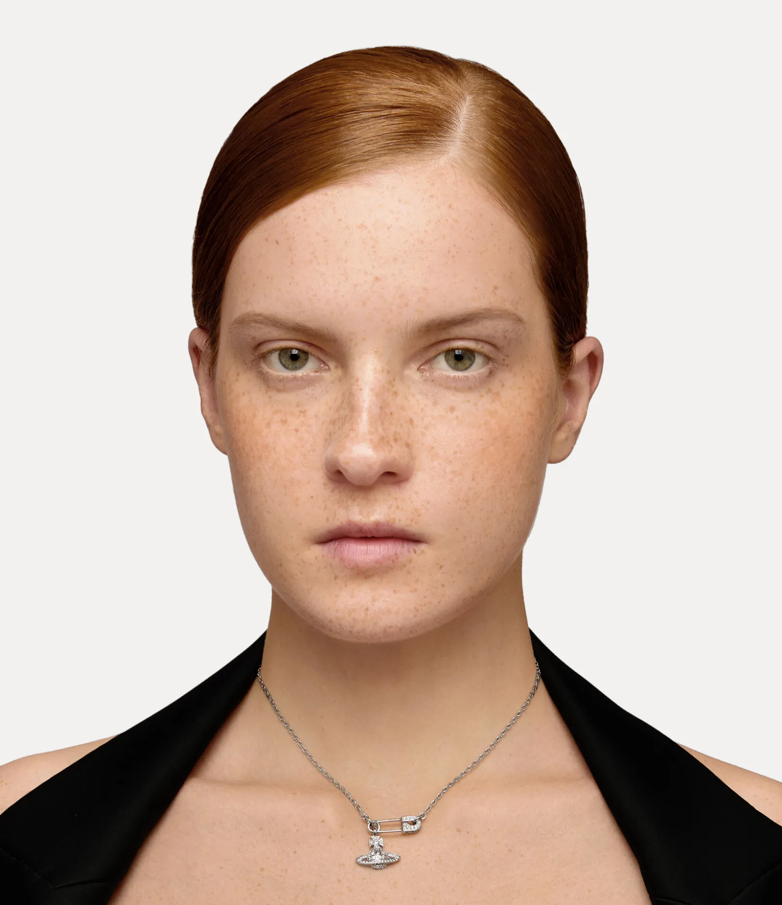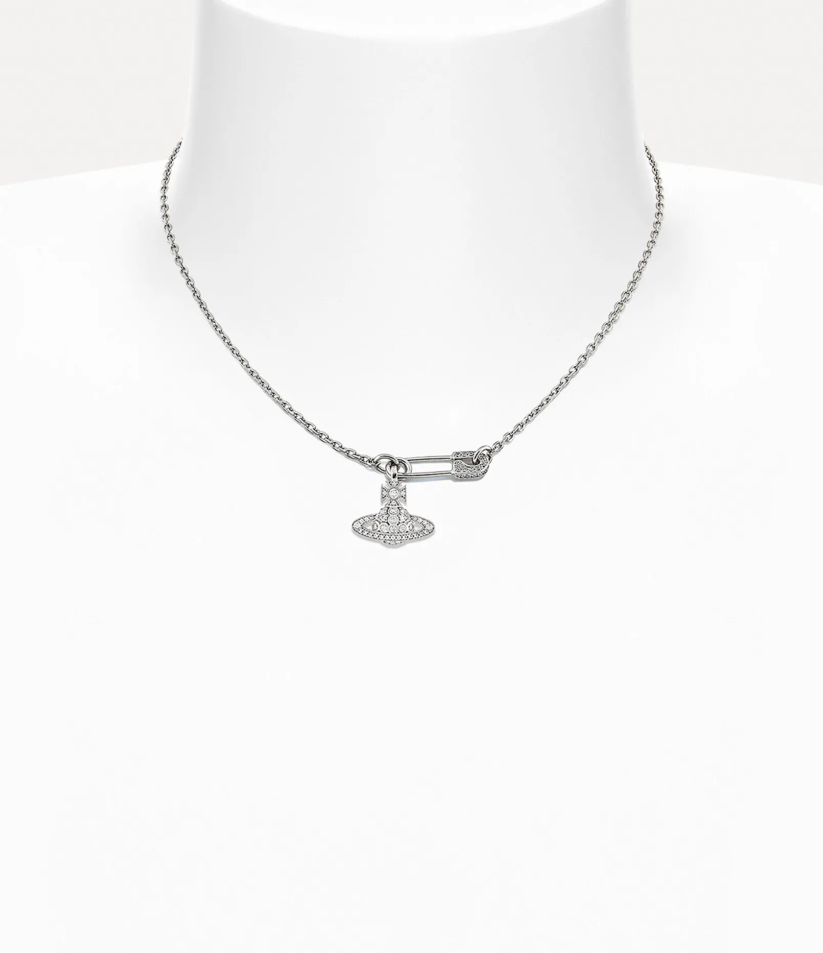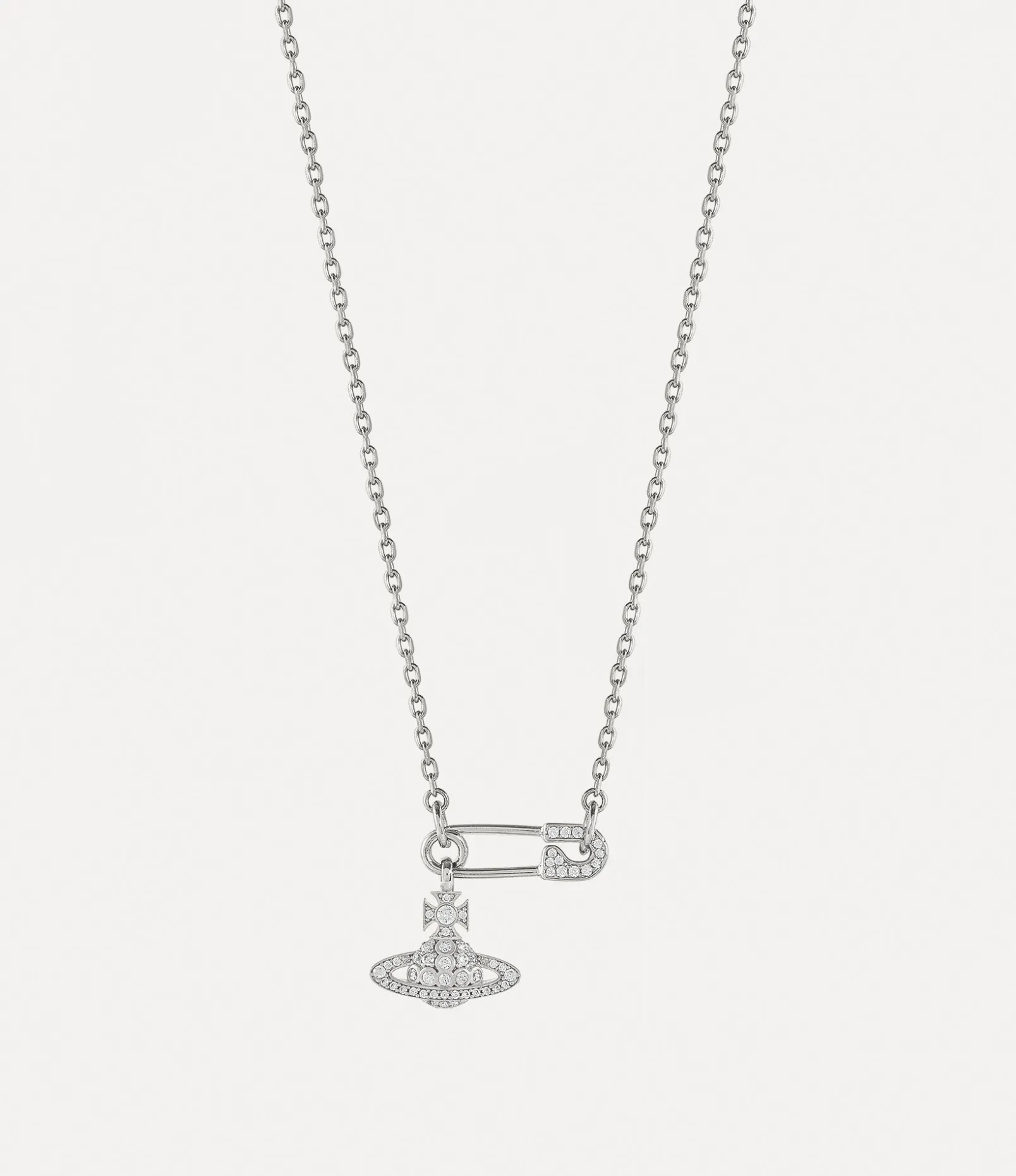 Our Lucrece Pendant necklace showcases crystal-embellished details in polished silver tones, accented by our signature safety pin motif alongside the iconic orb design. The safety pin, a timeless symbol of non-conformity, reflects Vivienne’s distinctive punk-inspired vision.
