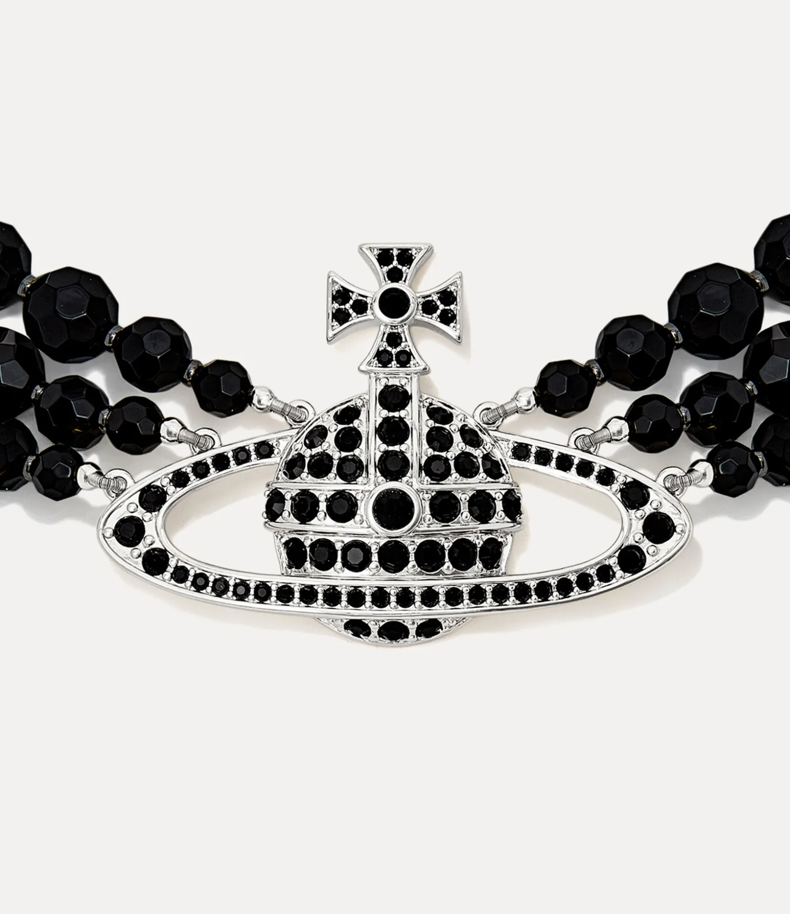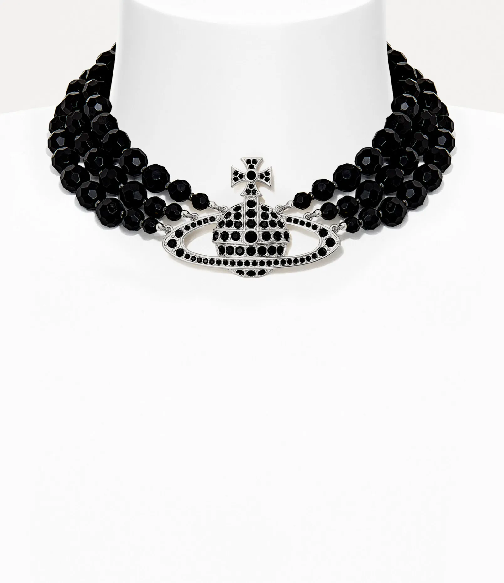 Our Messaline Three Row choker has been enhanced with hand-knotted black agate gemstone beads, complete with a carved finish. The statement choker is adorned with our signature orb pendant, embellished with jet black crystals, reflecting Vivienne’s vision of taking tradition into the future.