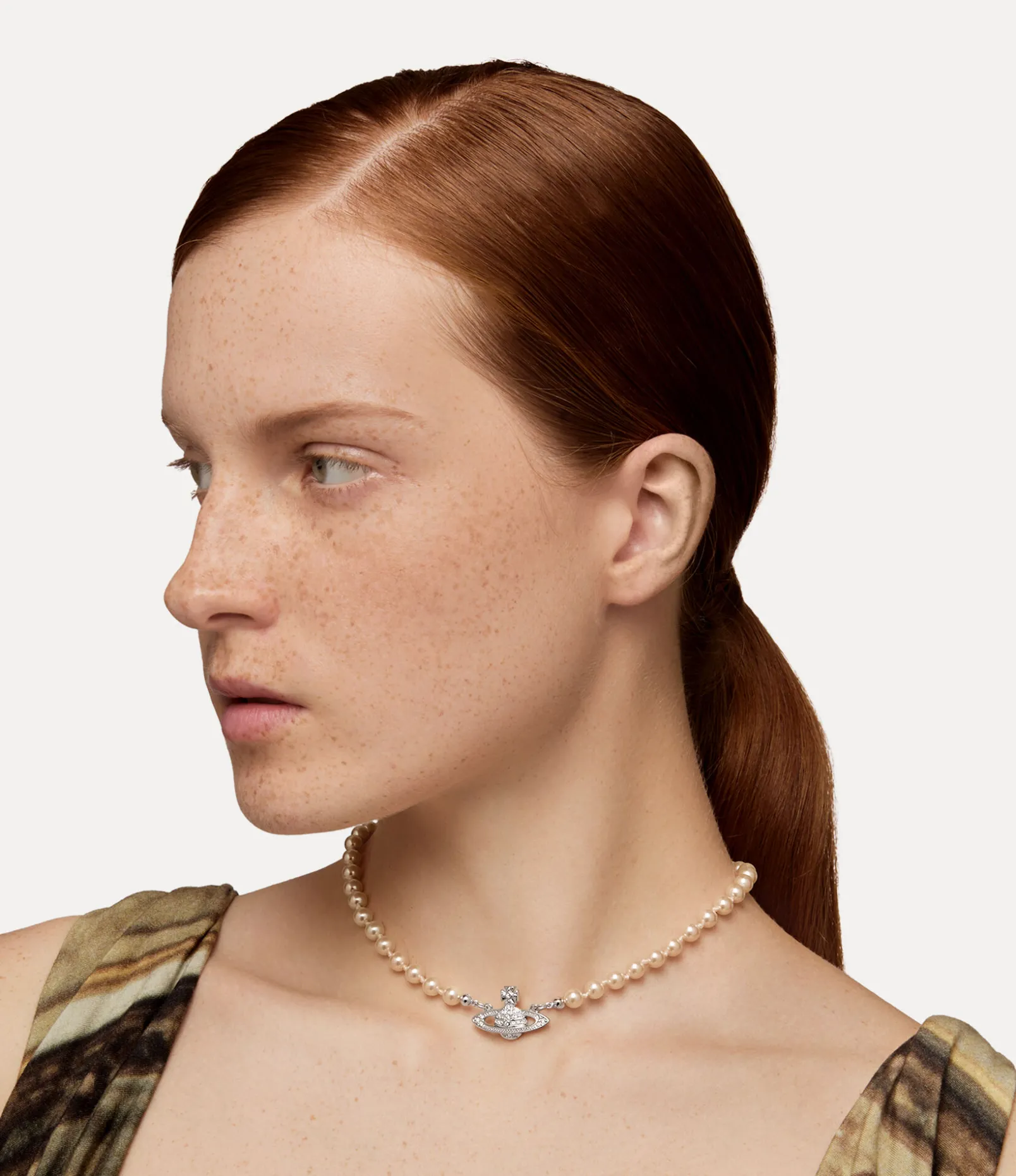 During the late 1980s, Vivienne Westwood debuted her timeless pearl concept in the Harris Tweed Fall 1987 fashion show, showcasing a single strand choker. The silhouette of our Mini Bas Relief Pearl choker pays homage to this design, complete with a two-dimensional orb motif at the centre of the design.