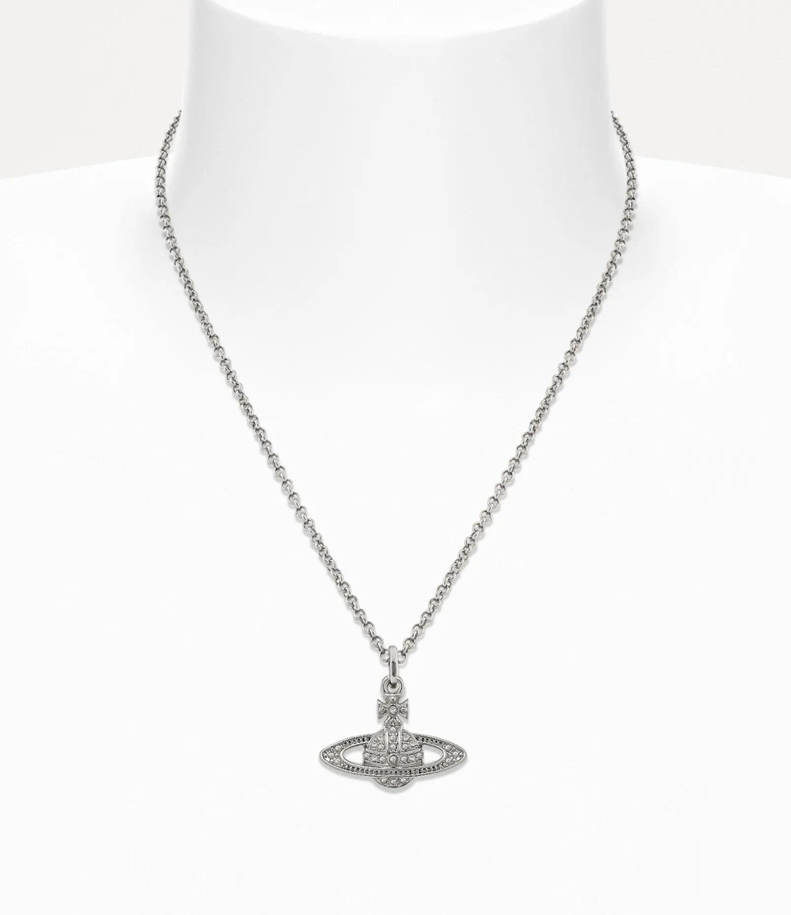 The orb is an essential element of the house’s iconography, evoking Vivienne’s vision of launching tradition into the future. Our Mini Bas Relief Pendant necklace features a crystal-encrusted orb at the centre of the design, complete with an engraved tag at the classic lobster clasp.