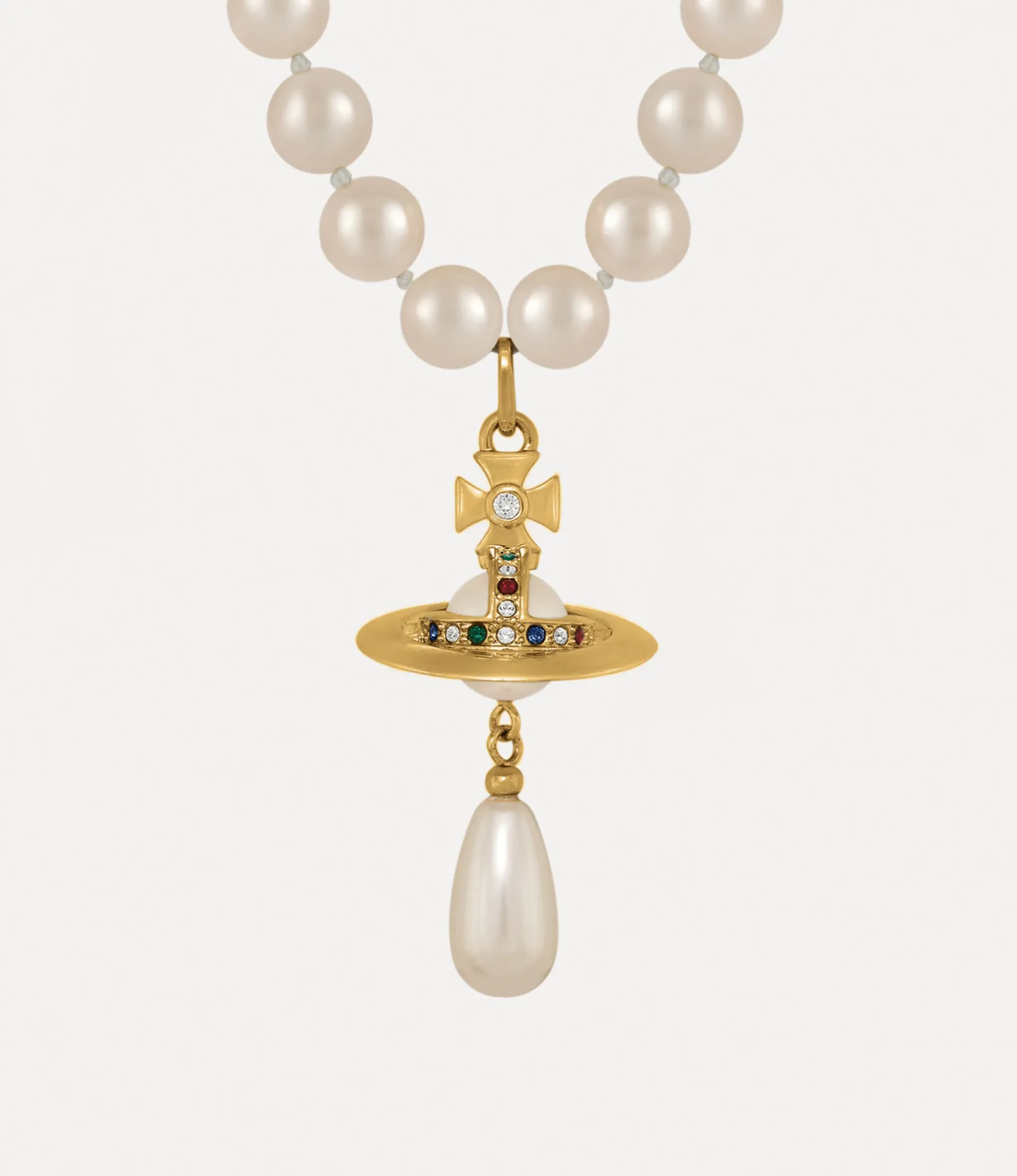 In the late 1980s, Vivienne Westwood unveiled her iconic pearl concept during the Harris Tweed Fall 1987 fashion show, featuring a single-strand choker. Our One Row Pearl Drop choker echoes the elegant form of her original design, showcasing a three-dimensional orb motif adorned with crystal accents and a suspended teardrop, pearl detail.