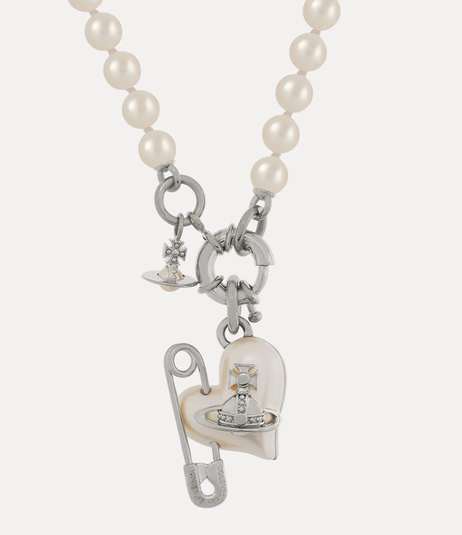 Crafted with silver-tone plating, the Orietta Pearl necklace features a row of 6mm glass-based Swarovski pearls, hand-knotted onto the thread. The design is highlighted by our signature asymmetric heart motif and a central orb, adorned with a safety pin detail – a nod to Vivienne’s punk-inspired, non-conformist aesthetic.