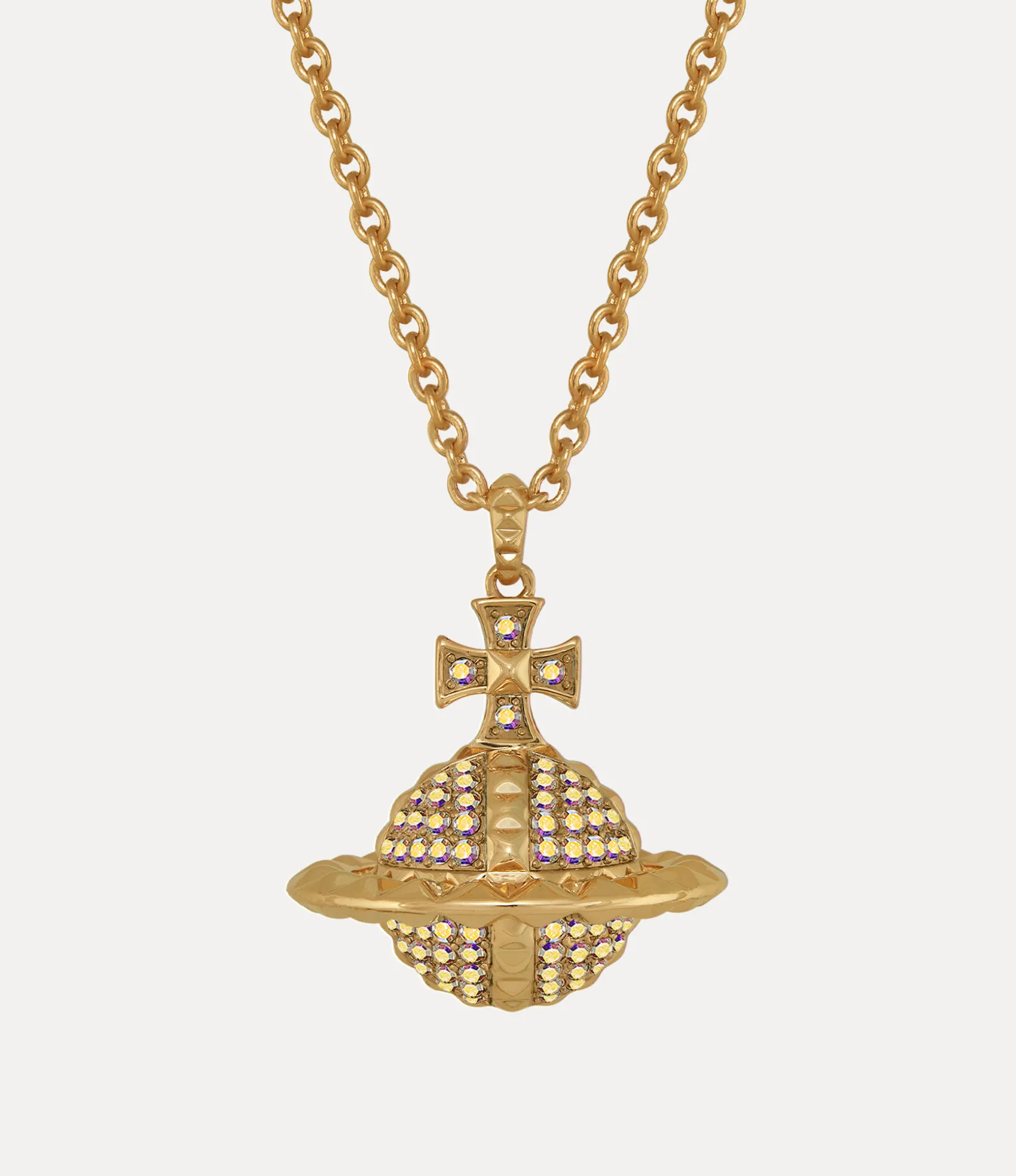 Our Mayfair Large Orb Pendant necklace has been updated with gold-tone plating and encrusted with iridescent gemstones. Pyramid-stud accents throughout the design symbolize non-conformity, paying tribute to the house’s iconic punk aesthetic. Featuring our signature orb motif, this statement piece embodies Vivienne’s vision of launching tradition into the future.