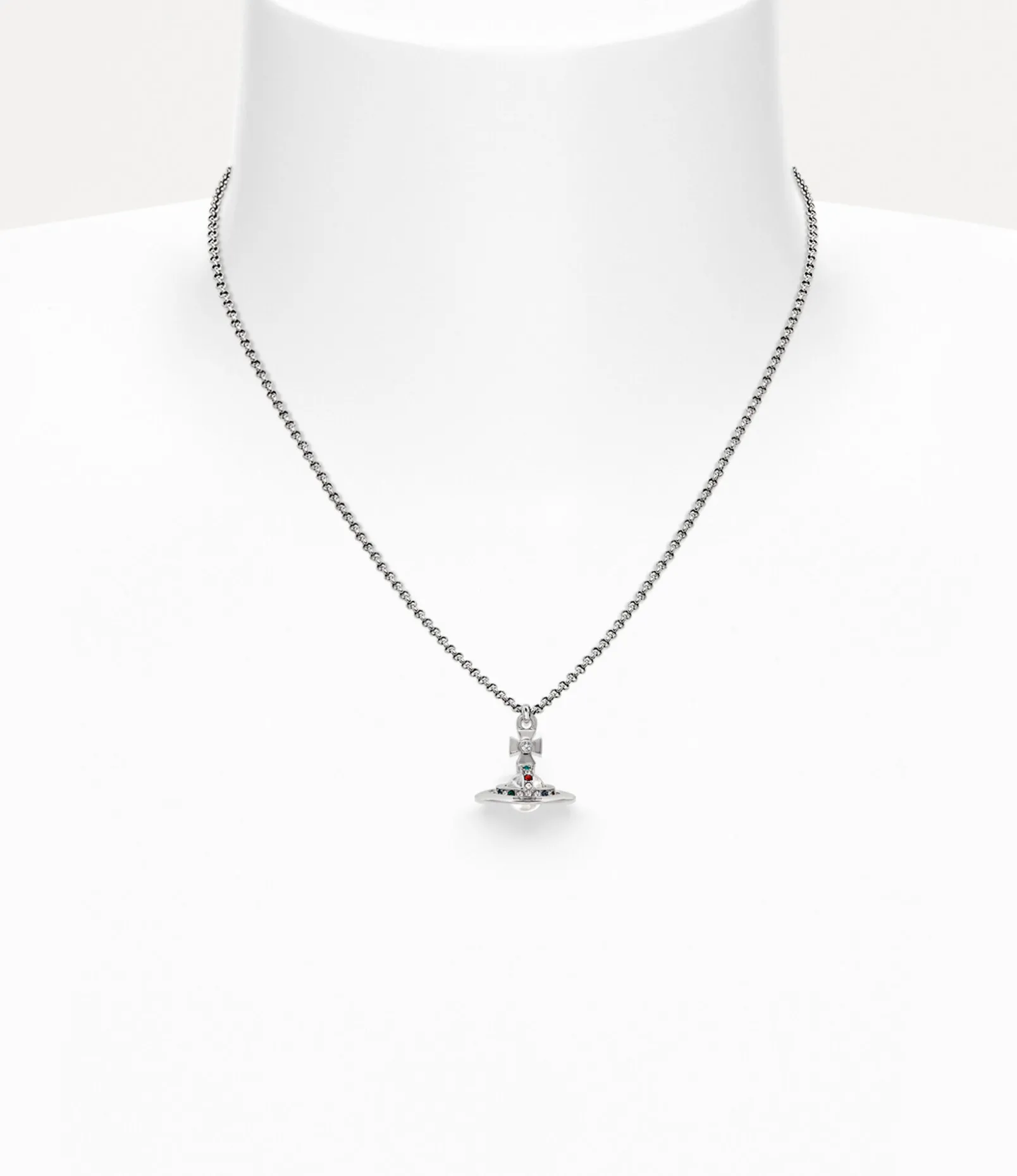 The orb silhouette is an essential element of the house’s iconography, recalling Vivienne’s vision of launching tradition into the future. Our New Petite Orb Pendant necklace receives an orb in the centre of the trace chain, adorned with red, emerald and white crystal details, complete with a silver-tone metal finish.