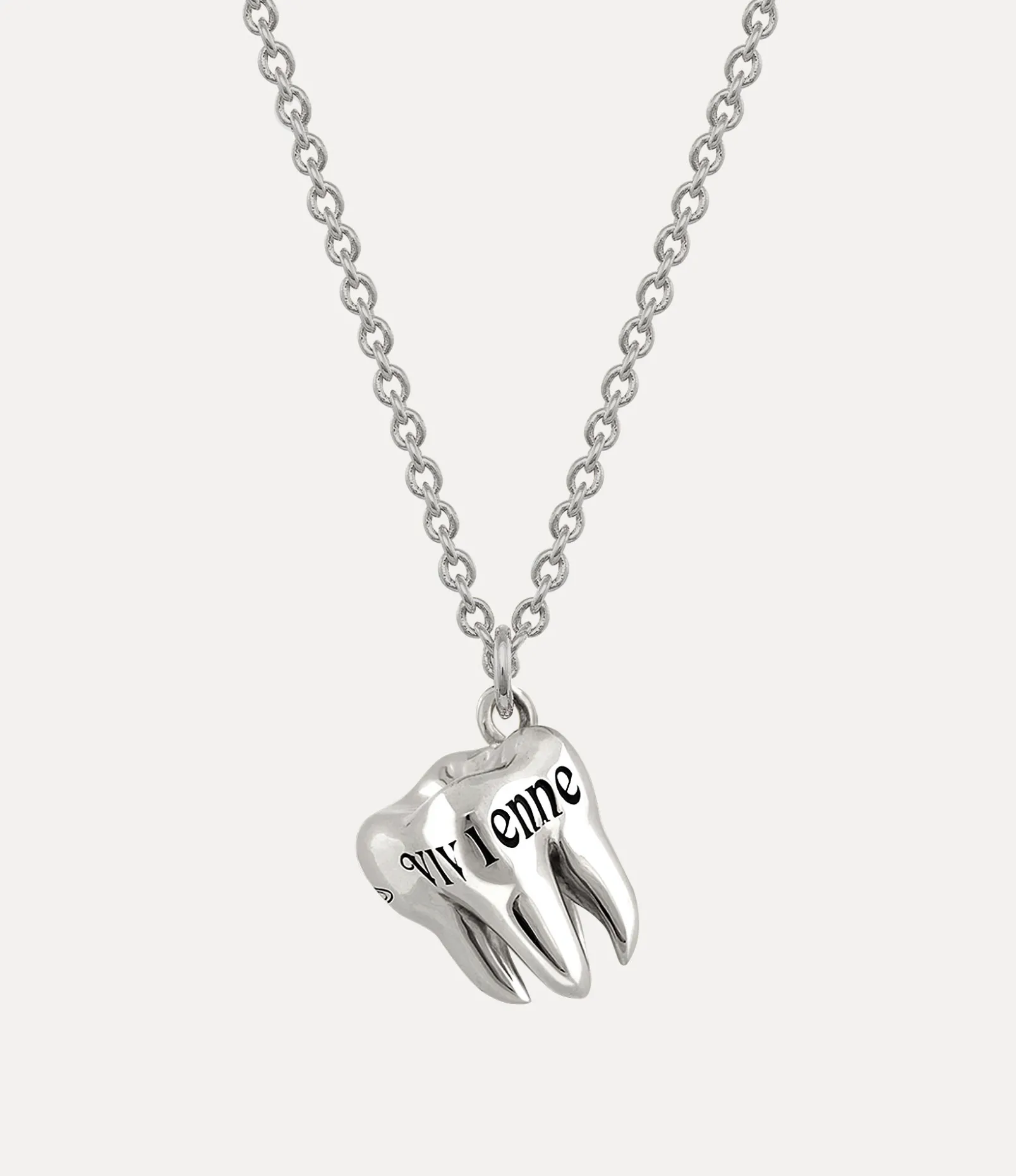 Our Rima pendant necklace is a nod to our longstanding tradition of teeth-inspired jewellery, tracing back to the iconic Spring-Summer 1997 ‘Vive La Bagatelle’ collection. Crafted with a polished plating finish, this pendant features intricate detailing on the tooth head, complete with the house’s signature in black patina. It hangs elegantly from a trace chain and is secured with a lobster clasp closure, accompanied by an engraved oval tag.