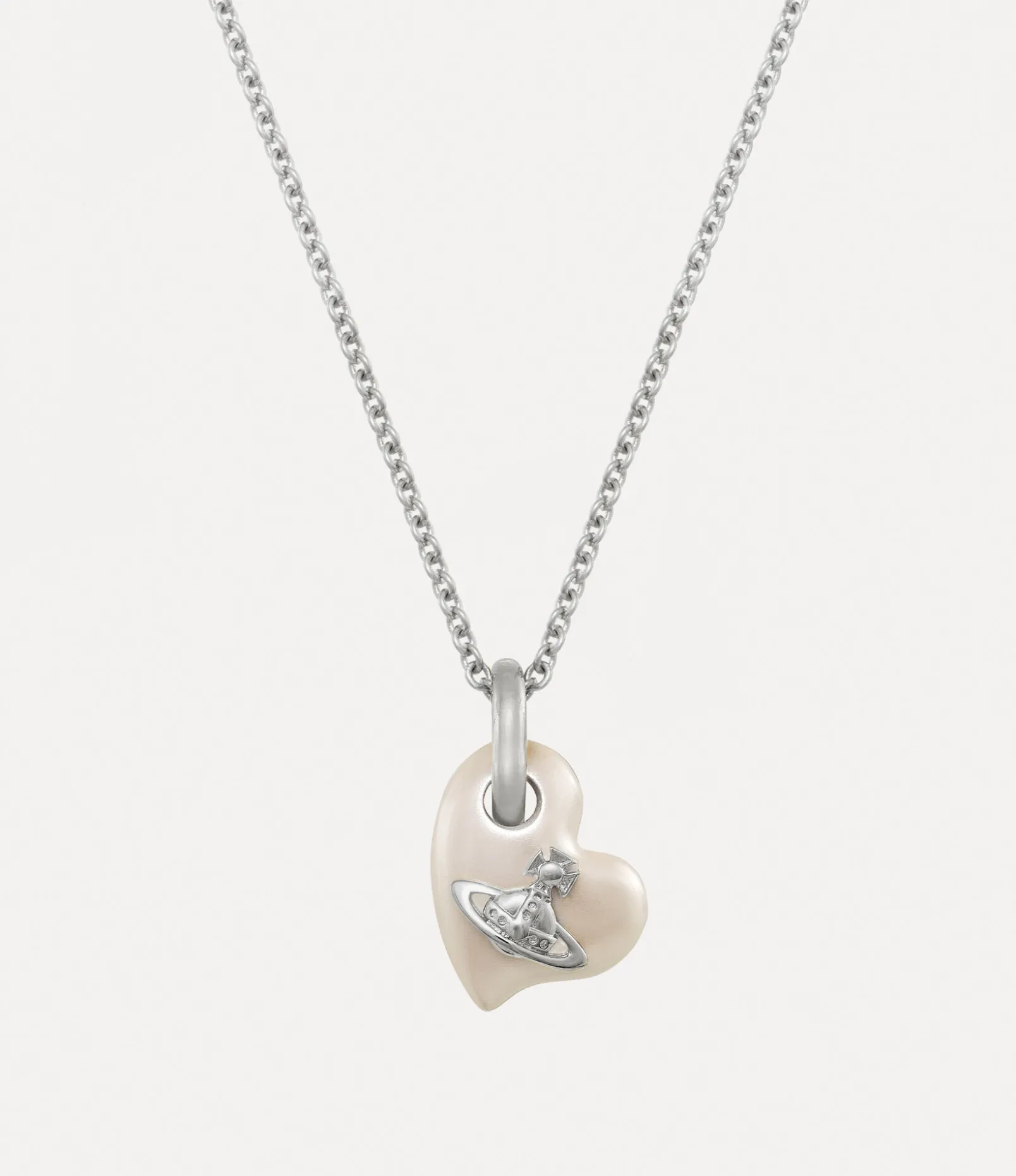 The asymmetric heart shape has become a signature style of the house, having appeared in many collections throughout our history. This season’s Florentia Pendant necklace receives an asymmetric heart motif, enhanced by a glistening pearl coating, finished with a plated orb motif in the centre of the design, synonymous with Vivienne’s vision of launching tradition into the future.