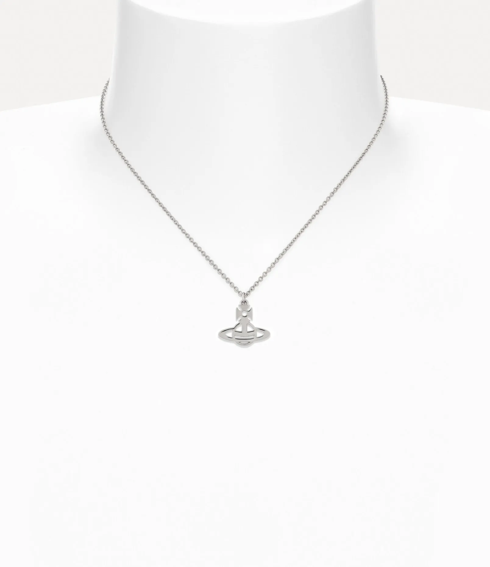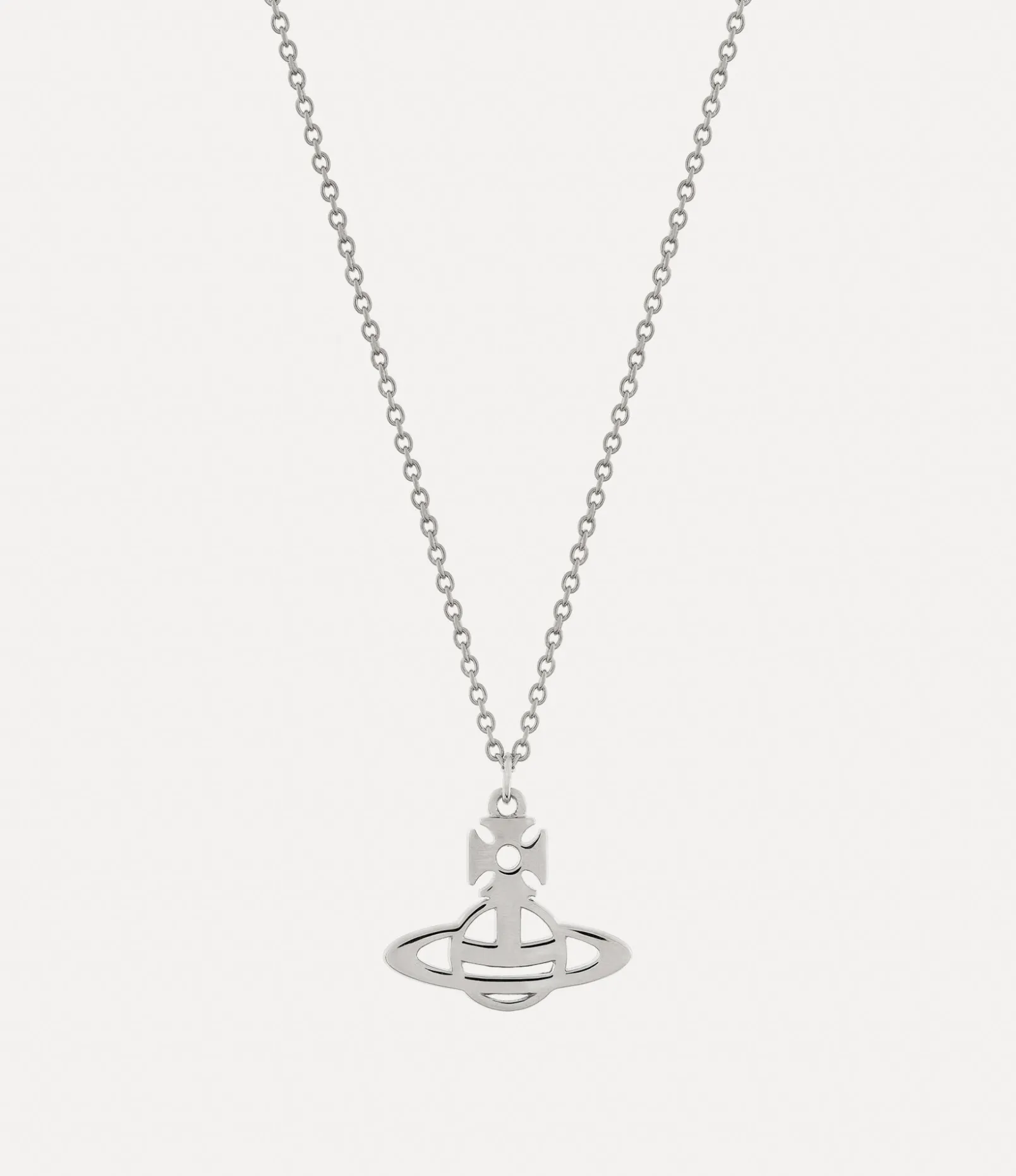 The Lucy Pendant necklace features a recycled silver silhouette, complete with a platinum-plated finish. The design takes inspiration from our classic orb motif, synonymous with Vivienne’s vision for taking tradition into the future, enhanced by cut-out detailing around the Saturn ring and cross top.