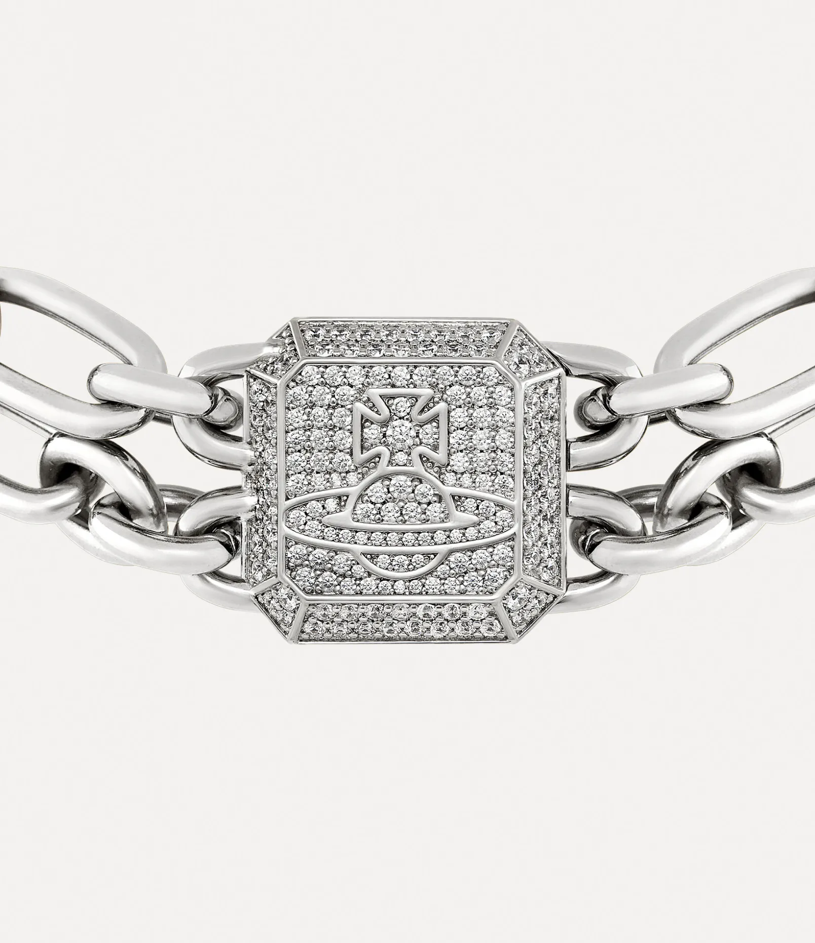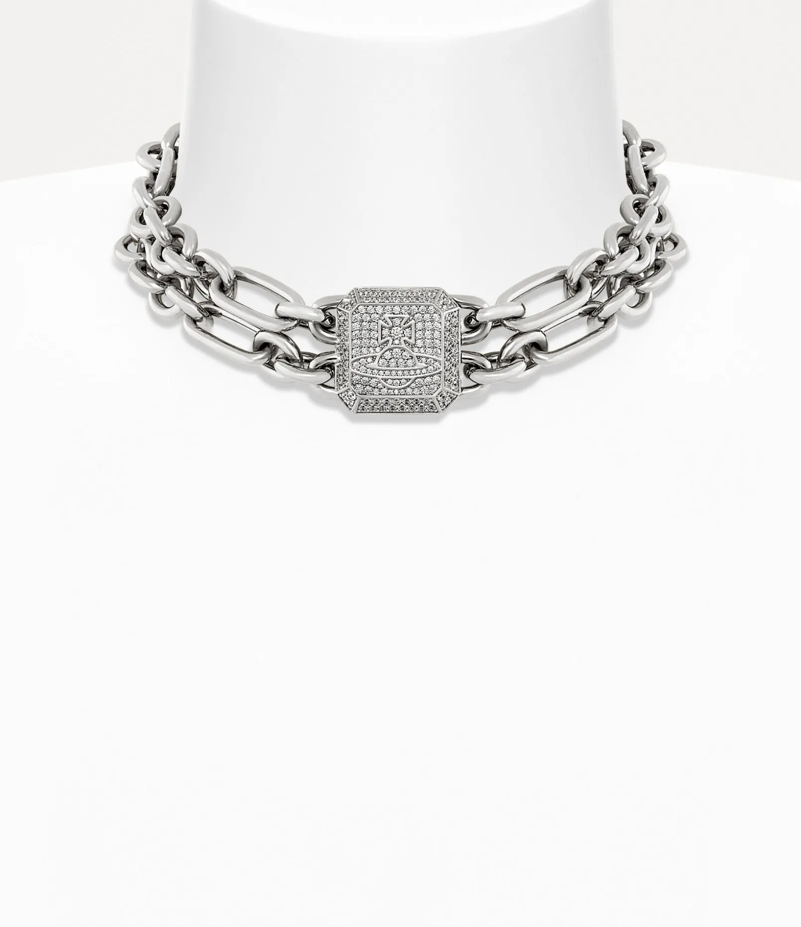 The Shelley choker, finished in a silver tone, features two rows of figaro-style chains that echo the brand’s signature punk aesthetic. As part of our Shelley collection, this piece showcases an octagonal plaque adorned with pavé-set crystals outlining our iconic orb, capturing Vivienne’s vision of launching tradition into the future.