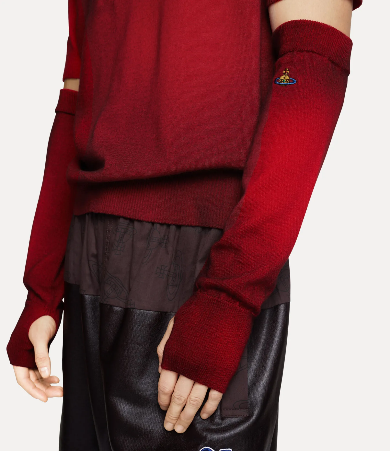 Our Eli arm warmers feature a soft woollen silhouette, complete with a hand-sprayed pattern that contours the shape of the arm and hand. The piece receives a multicoloured embroidered orb on the right-hand side, synonymous with Vivienne’s vision of launching tradition into the future.
