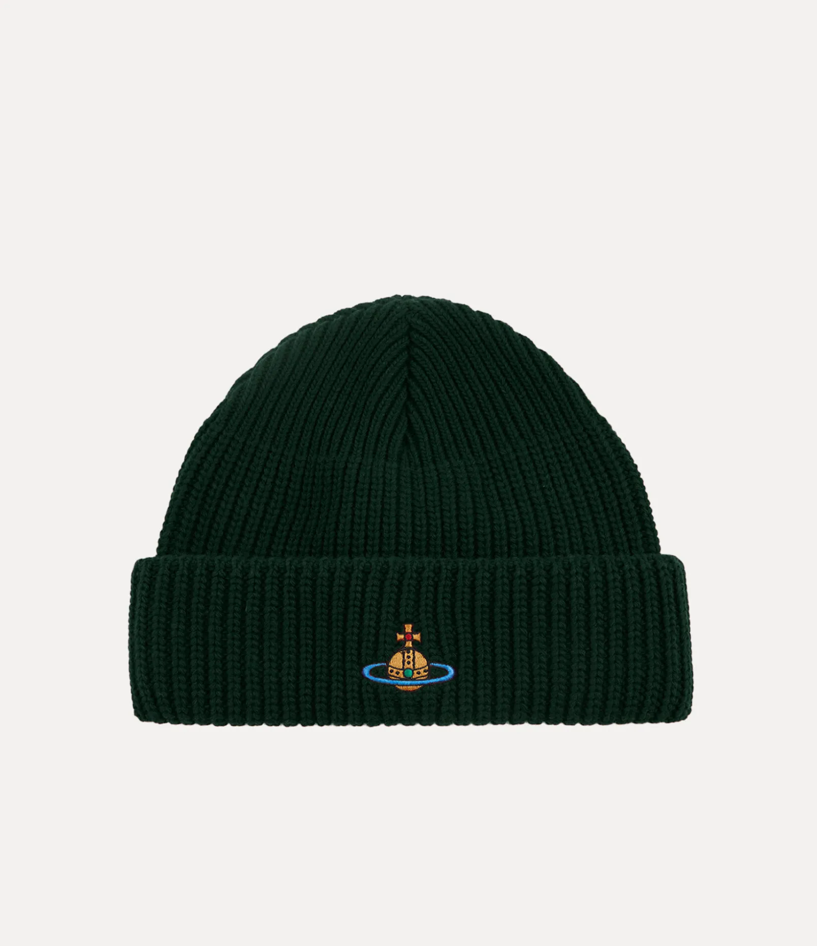 Our Sporty beanie features an all-over ribbed finish, complete with a chunky knit. The multicoloured orb embroidery on the front of the wide folded brim draws inspiration from the house’s iconic orb motif – synonymous with Vivienne’s vision of launching tradition into the future.