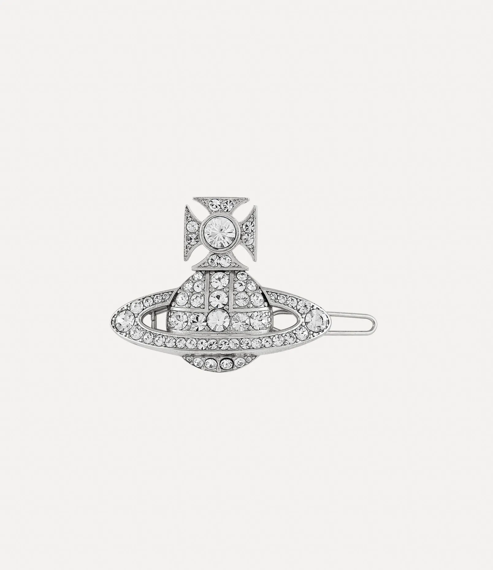 Our Corinne hair clip is cast to the silhouette of our house’s bas relief orb motif, evoking Vivienne’s vision of launching tradition into the future. The two-dimensional design features pave-set crystal details in white hues, complete with a classic silver-tone finish.