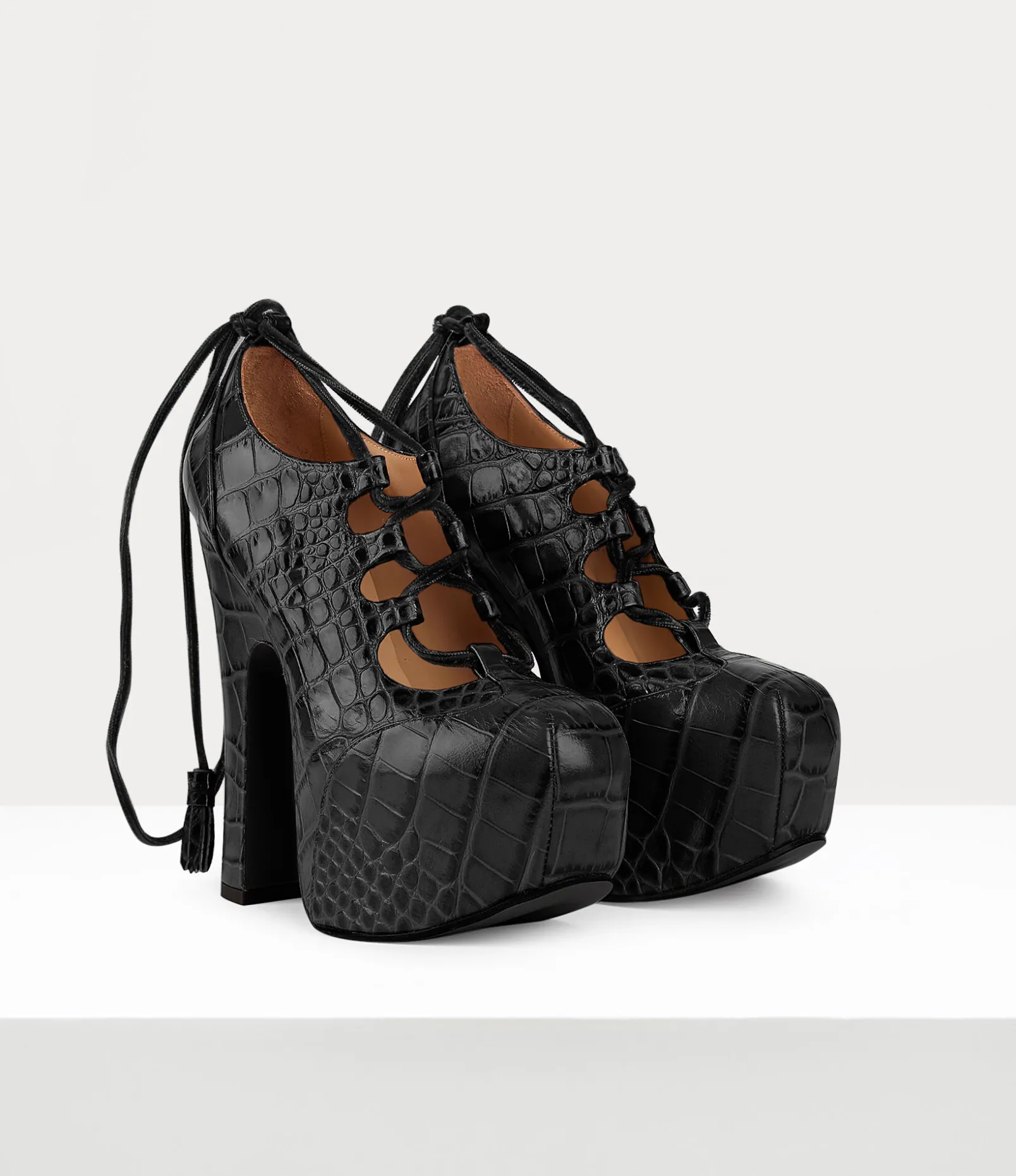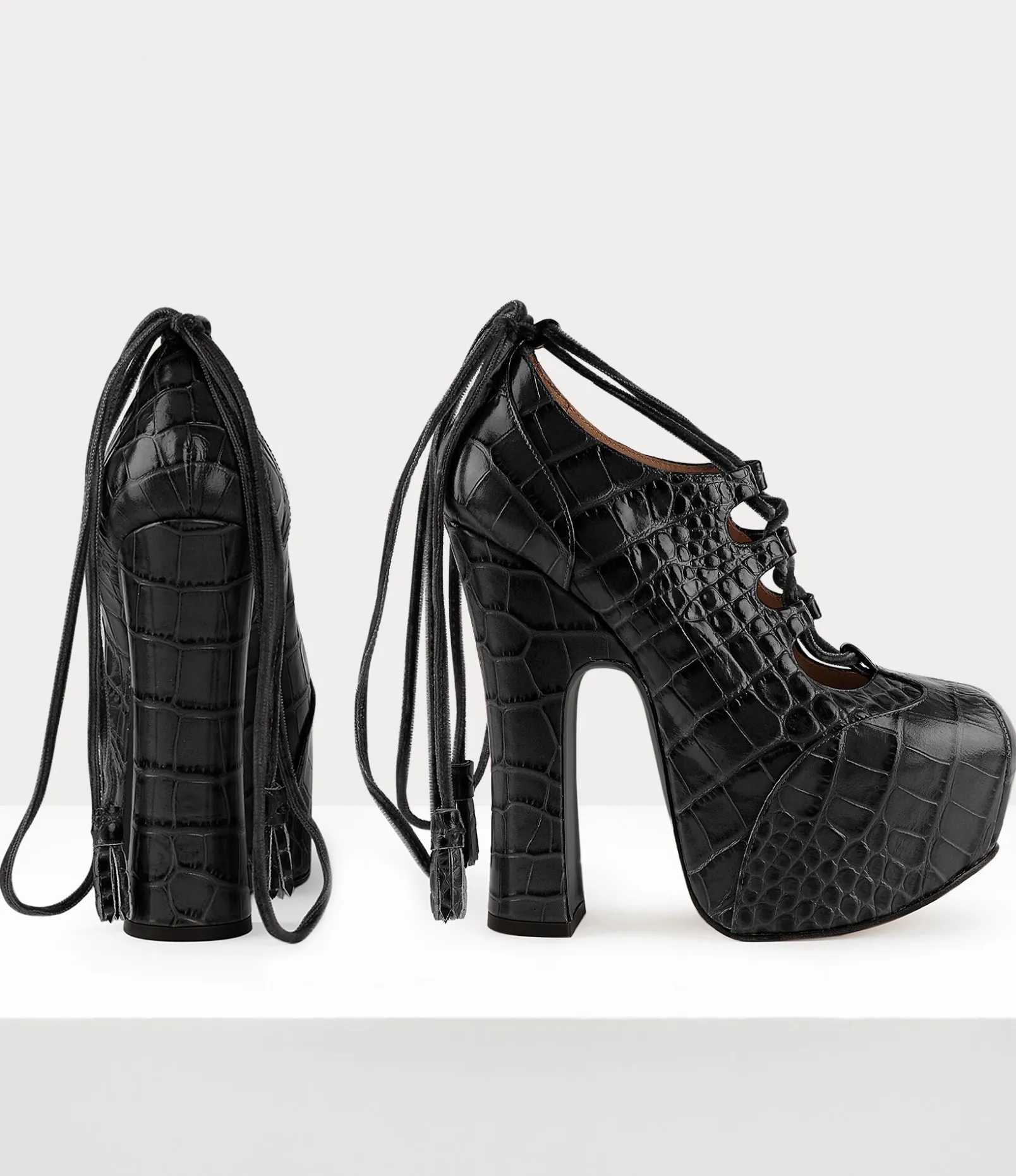 The design of the Elevated Ghille platforms, first shown in our Spring-Summer 1993 ‘Anglomania’ collection in Paris, recalls the silhouette of ghillie brogues, traditional Scottish shoes worn with Highland dress. The piece is offered in a croc-embossed finish, complete with tassel fastenings and an elevated, bold platform sole.