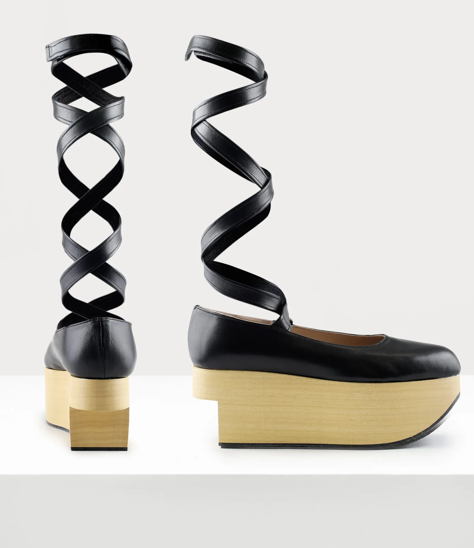 Our Rocking Horse Ballerina shoes were first revealed in the Vivienne Westwood Spring-Summer 1985 ‘Mini-Crini’ collection, designed to achieve poise and movement. The cut-out detail in the wooden platform elevates the overall silhouette, paying homage to the original style.