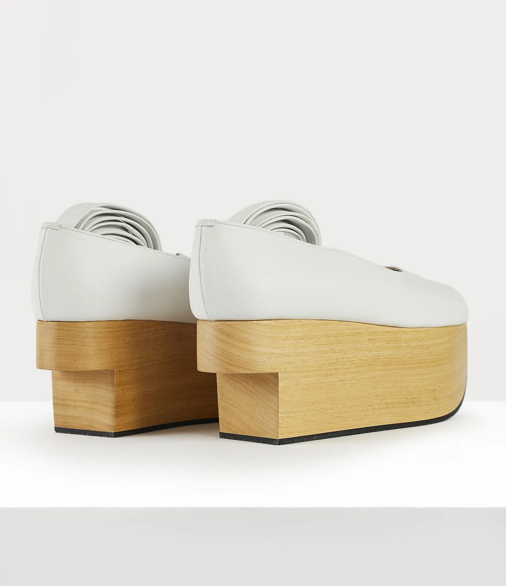 Our Rocking Horse Ballerina shoes were first revealed in the Vivienne Westwood Spring-Summer 1985 ‘Mini-Crini’ collection, designed to achieve poise and movement. The cut-out detail in the wooden platform elevates the overall silhouette, paying homage to the original style.