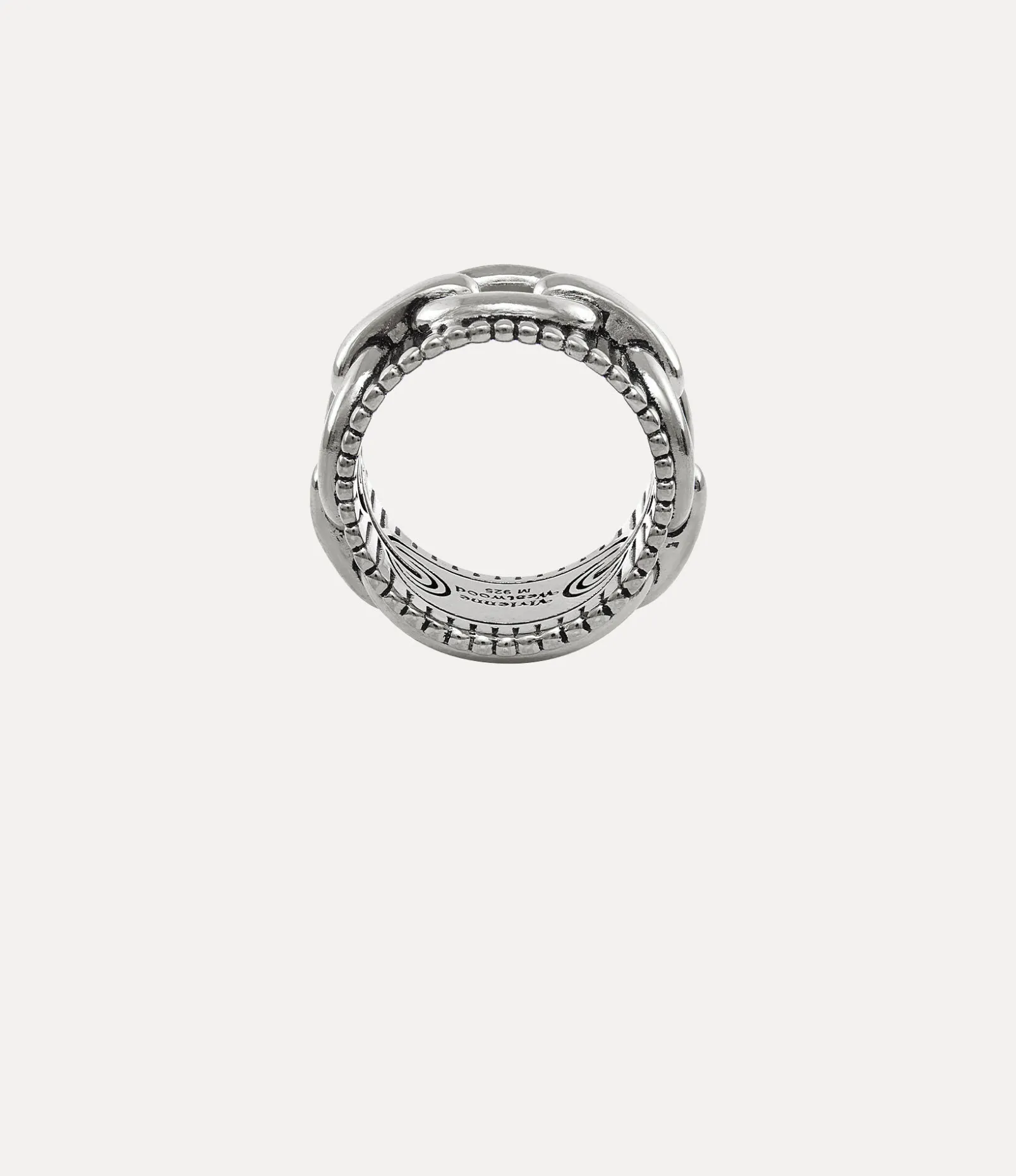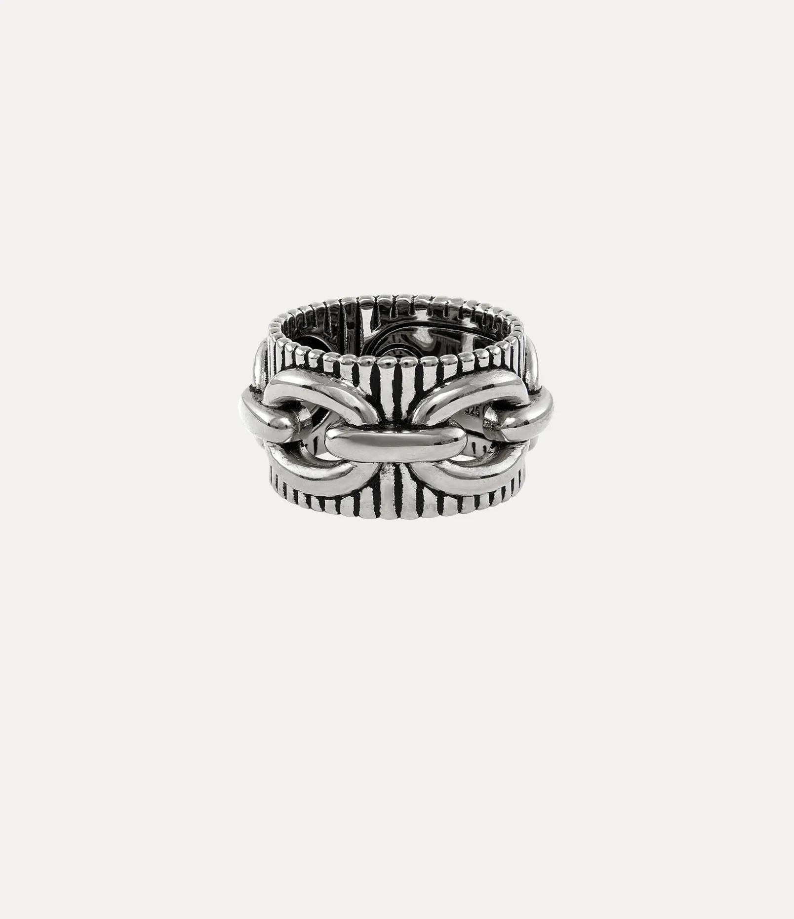 Our Ciaran ring features a wide band, complete with a recycled silver finish, enhanced by platinum-tone plating. The piece is adorned with textured line details and chain-style links, with a engraved orb motif on the face – synonymous with Vivienne’s vision of launching tradition into the future.