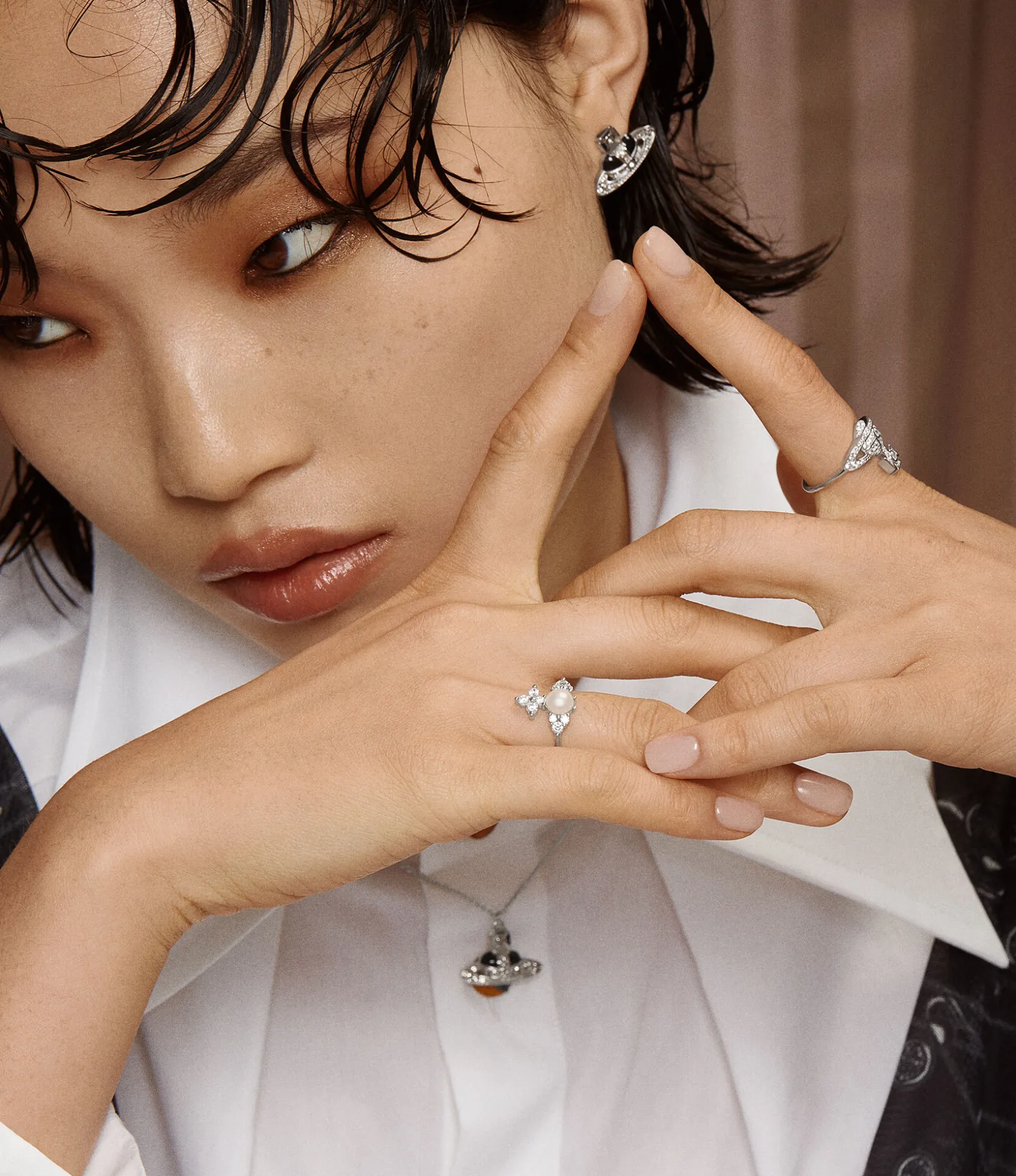 The Feodora ring in platinum-plated silver takes the shape of our classic orb motif, reflecting Vivienne’s vision of propelling tradition into the future. The piece features white crystal details in a prong setting, complete with a glass pearl detail at the centre, an essential element of the house’s iconography.