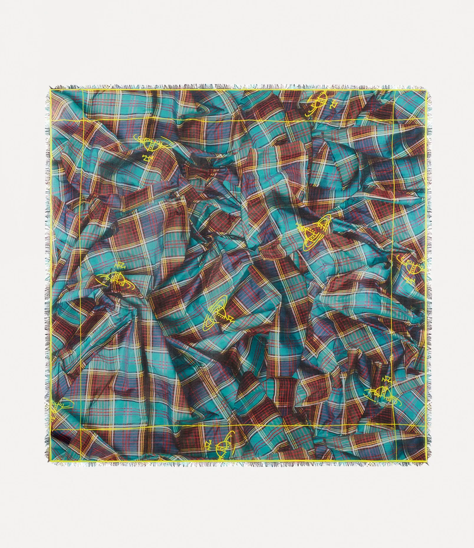 This season’s square showcases our signature ‘Draped Tartan’ motif, a homage to the vibrant wallpaper adorning the walls of our Vivienne Westwood headquarters. The design incorporates our timeless orb motif, representing Vivienne’s commitment to merging tradition with innovation.