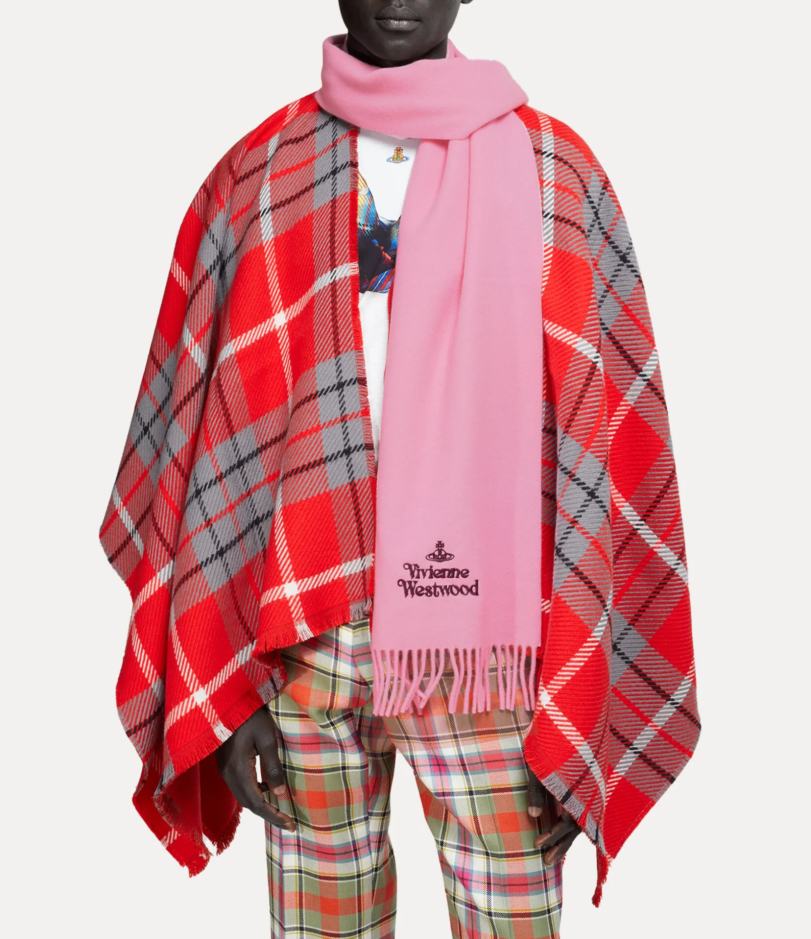 Our Embroidered scarf, crafted in Italy from wool, features long fringed edges and showcases the house’s signature lettering and orb motif embroidered in contrasting thread, embodying Vivienne’s commitment to launching tradition into the future.