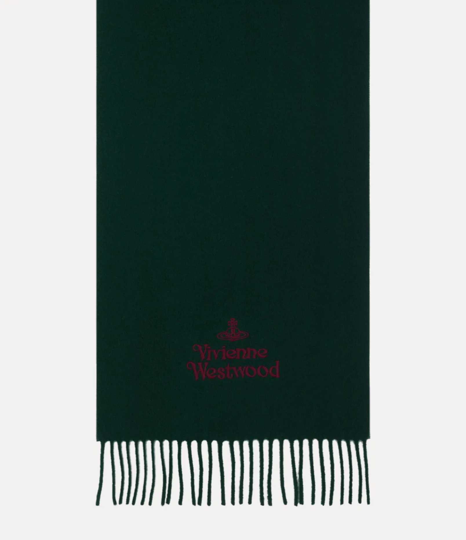 Our Embroidered scarf, crafted in Italy from wool, features long fringed edges and showcases the house’s signature lettering and orb motif embroidered in contrasting thread, embodying Vivienne’s commitment to launching tradition into the future.