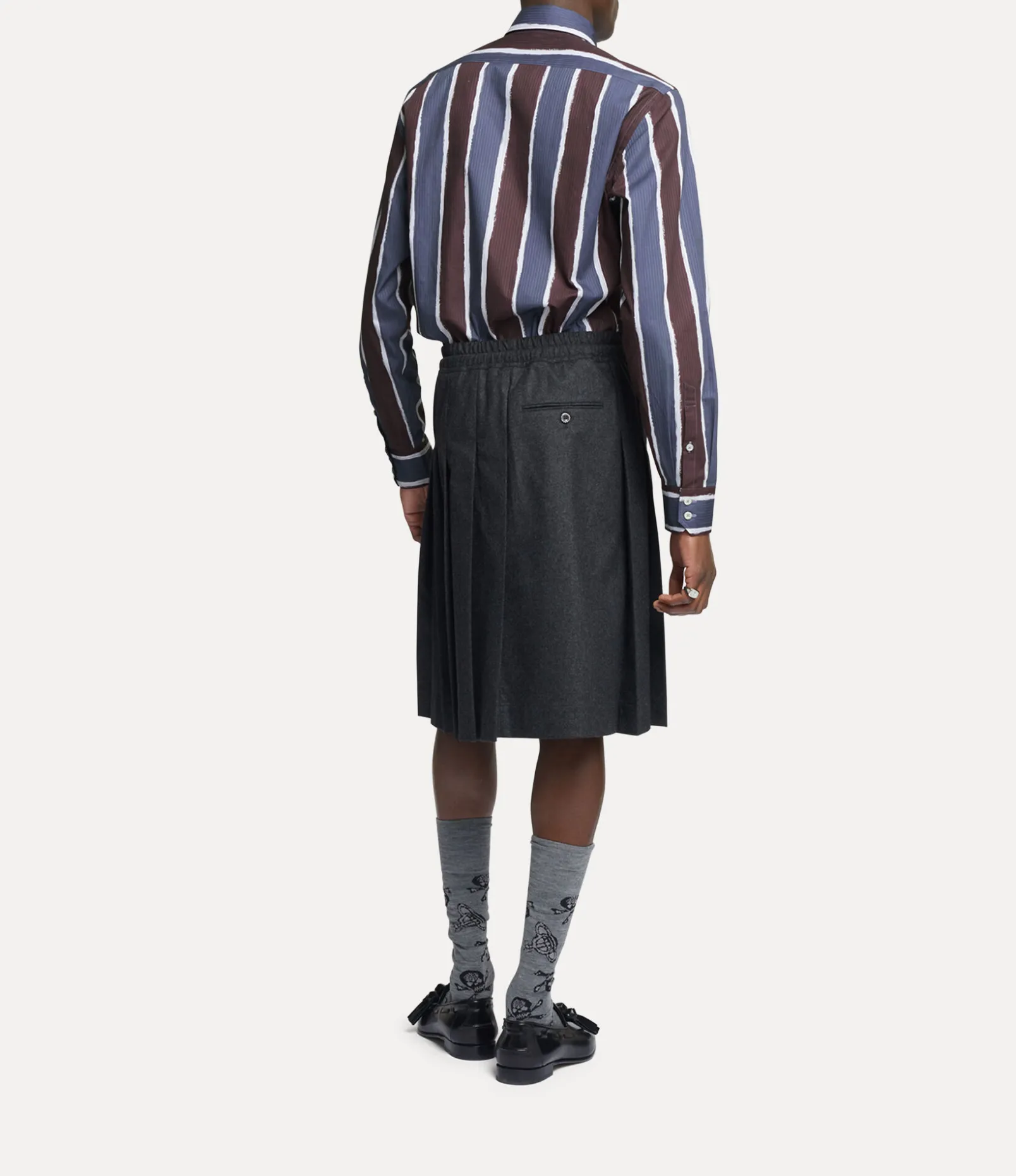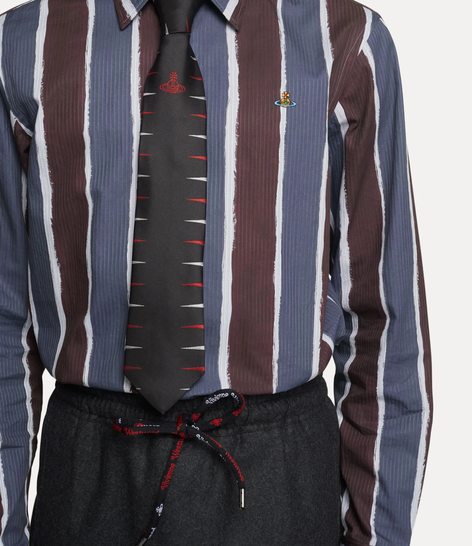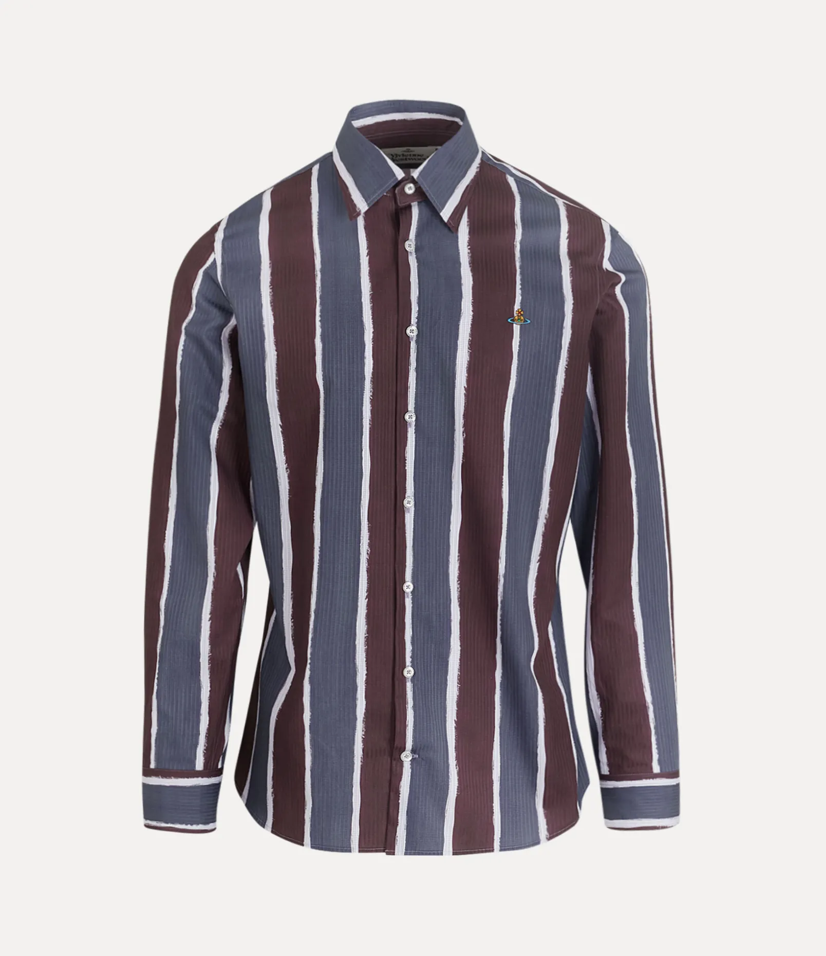 This season’s Ghost shirt receives an all-over variegated stripe pattern, taken from a Vivienne Westwood men’s jacket from the Autumn-Winter 1998 ‘Dressed To Scale’ collection. The piece is embroidered with a multicoloured orb on the left-hand side of the chest – synonymous with Vivienne’s vision of taking tradition into the future.