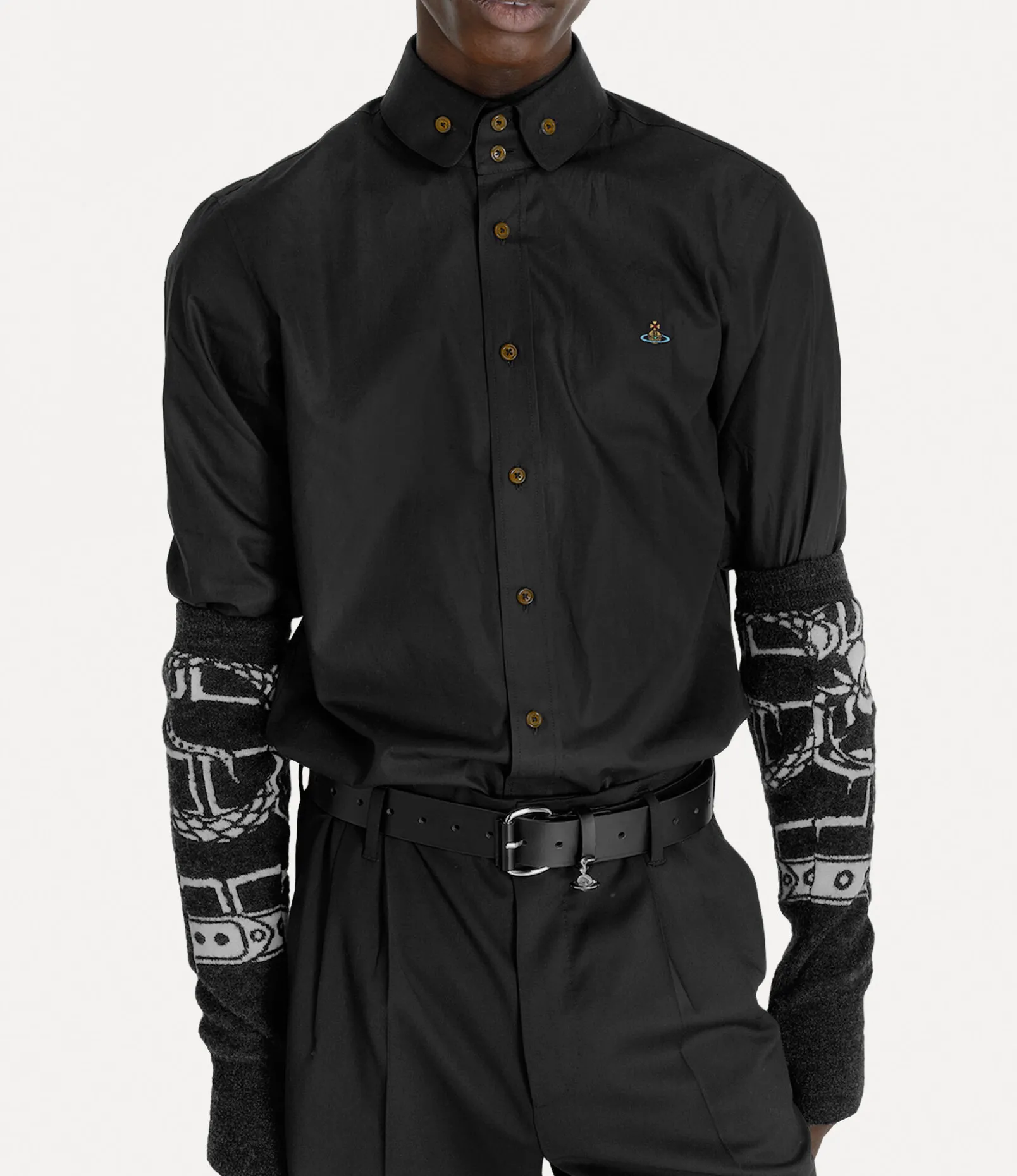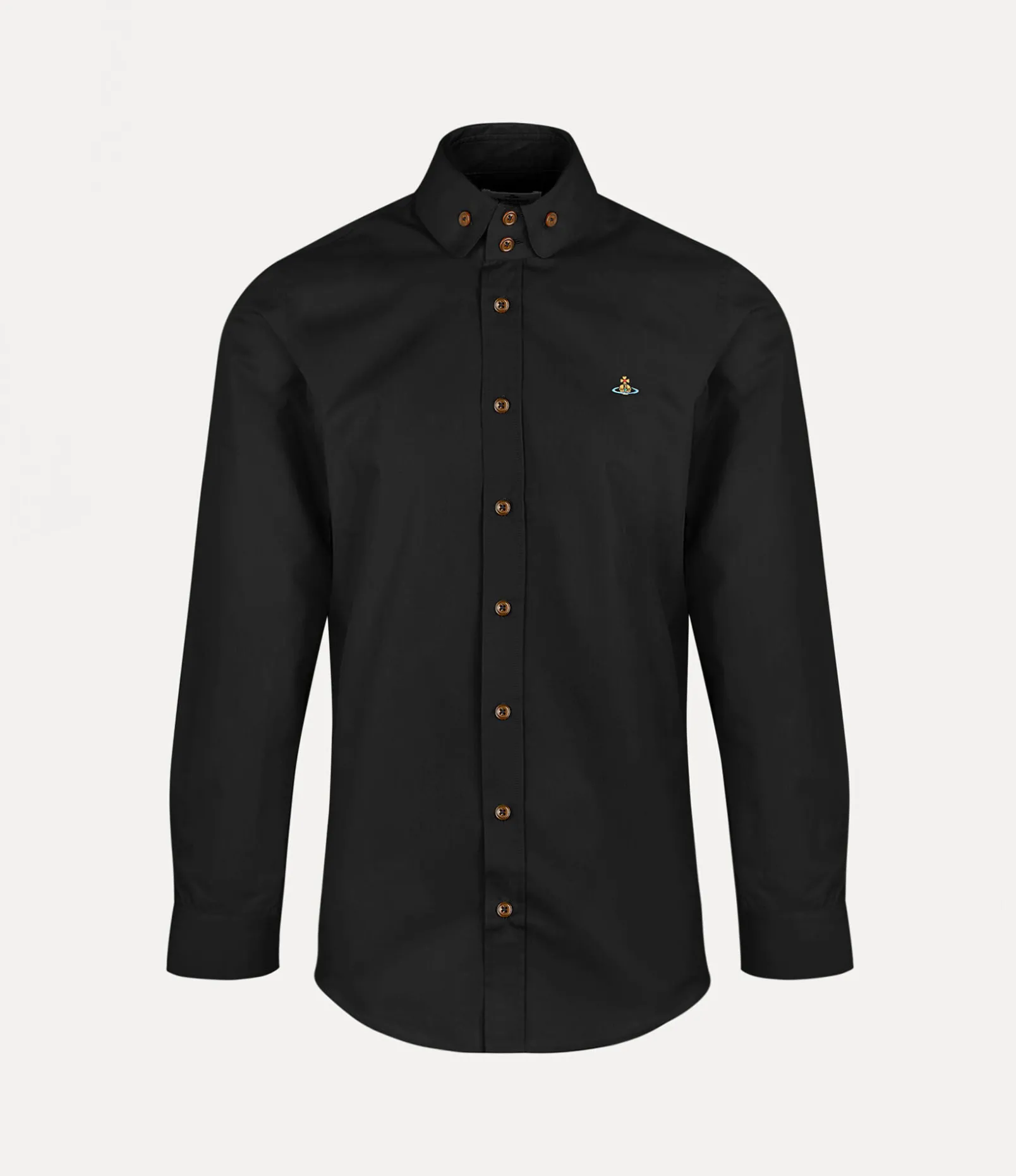The silhouette of the Two Button Krall shirt draws inspiration from an archival design, showcasing Vivienne’s iconic two-button collar. The piece receives our signature orb embroidery on the left-hand side of the chest – synonymous with Vivienne’s vision of launching tradition into the future.