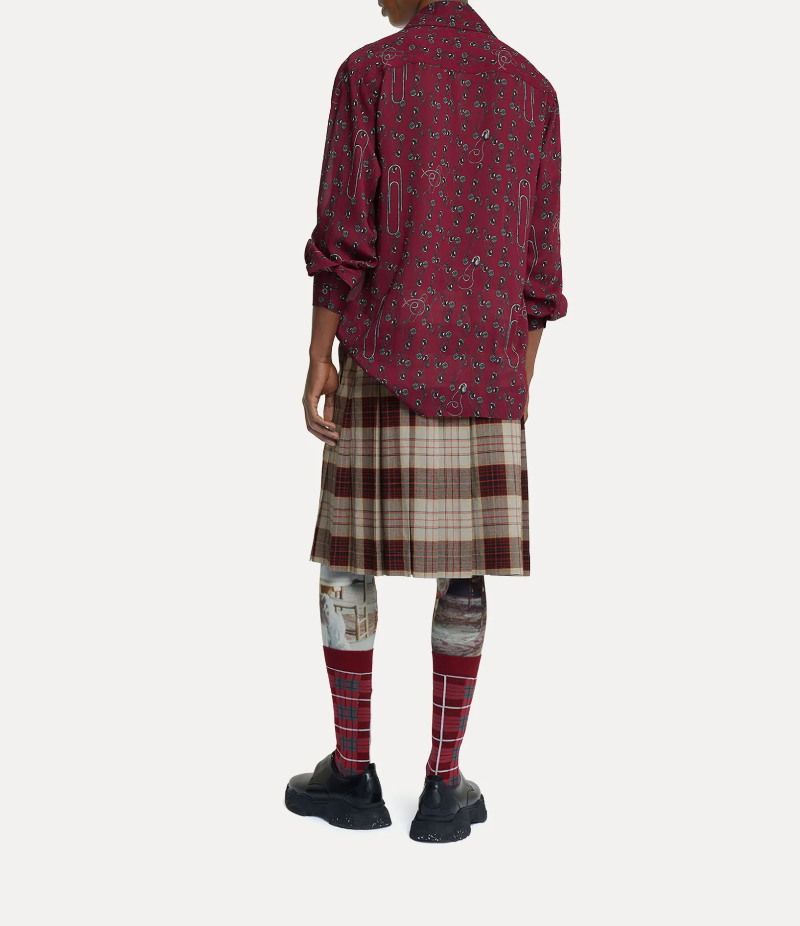 Our signature kilt has been reimagined in a muted tartan pattern this season, first appearing in the Vivienne Westwood 1993 Anglomania collection. As part of our new collection, the piece features our updated letter branding motif on the mother-of-pearl button fastenings, complete with a shoelace closure at the waistband.