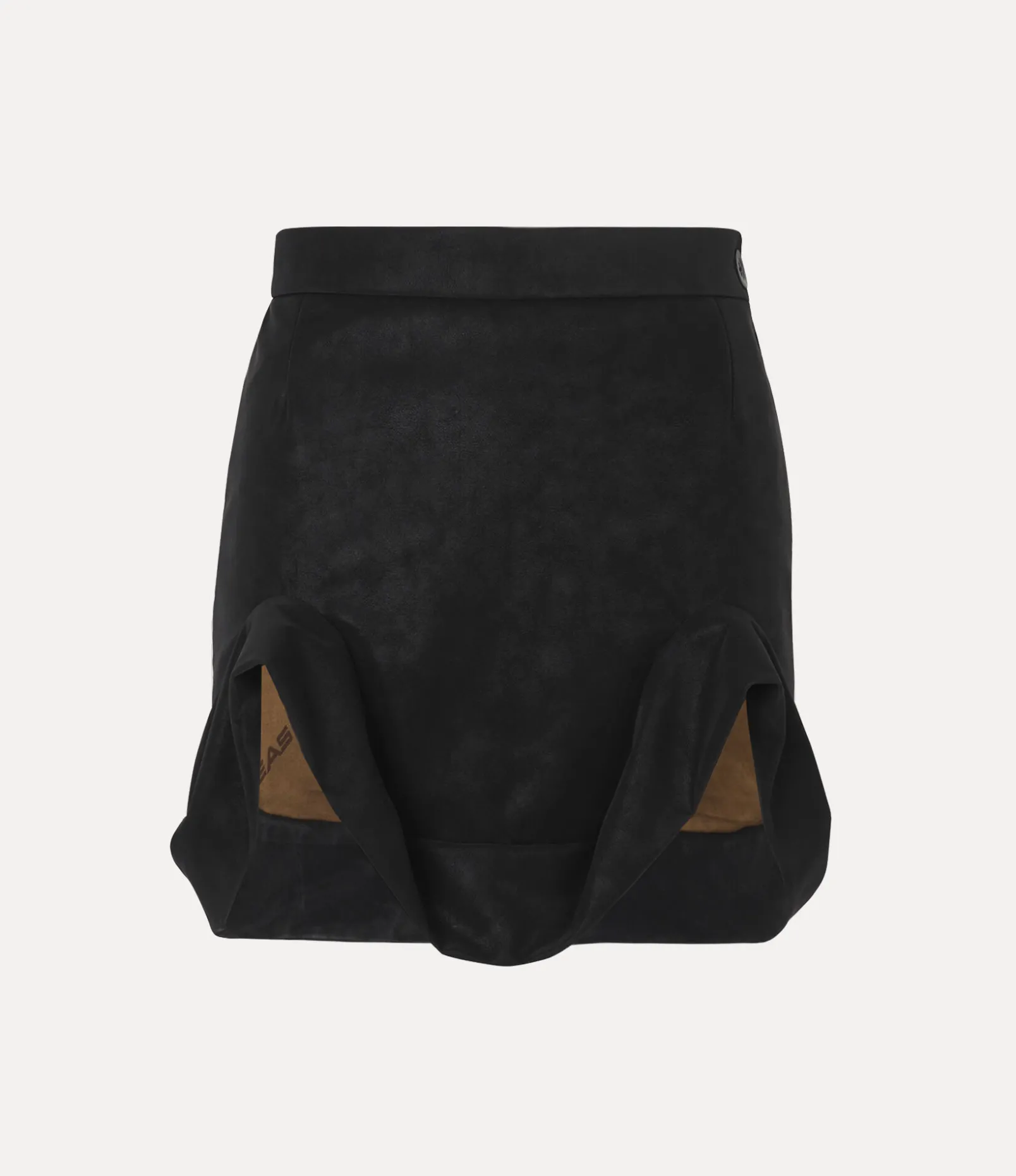 The Mini Frame Skirt from our Andreas Kronthaler for Vivienne Westwood collection is offered in a nubuck blend this season, featuring intricately curved leg cut-outs at the hemline, accentuated by draped detailing. As part of our latest range, the piece receives our newly updated jacquard lining, adorned with the ‘Andreas’ letter motif.