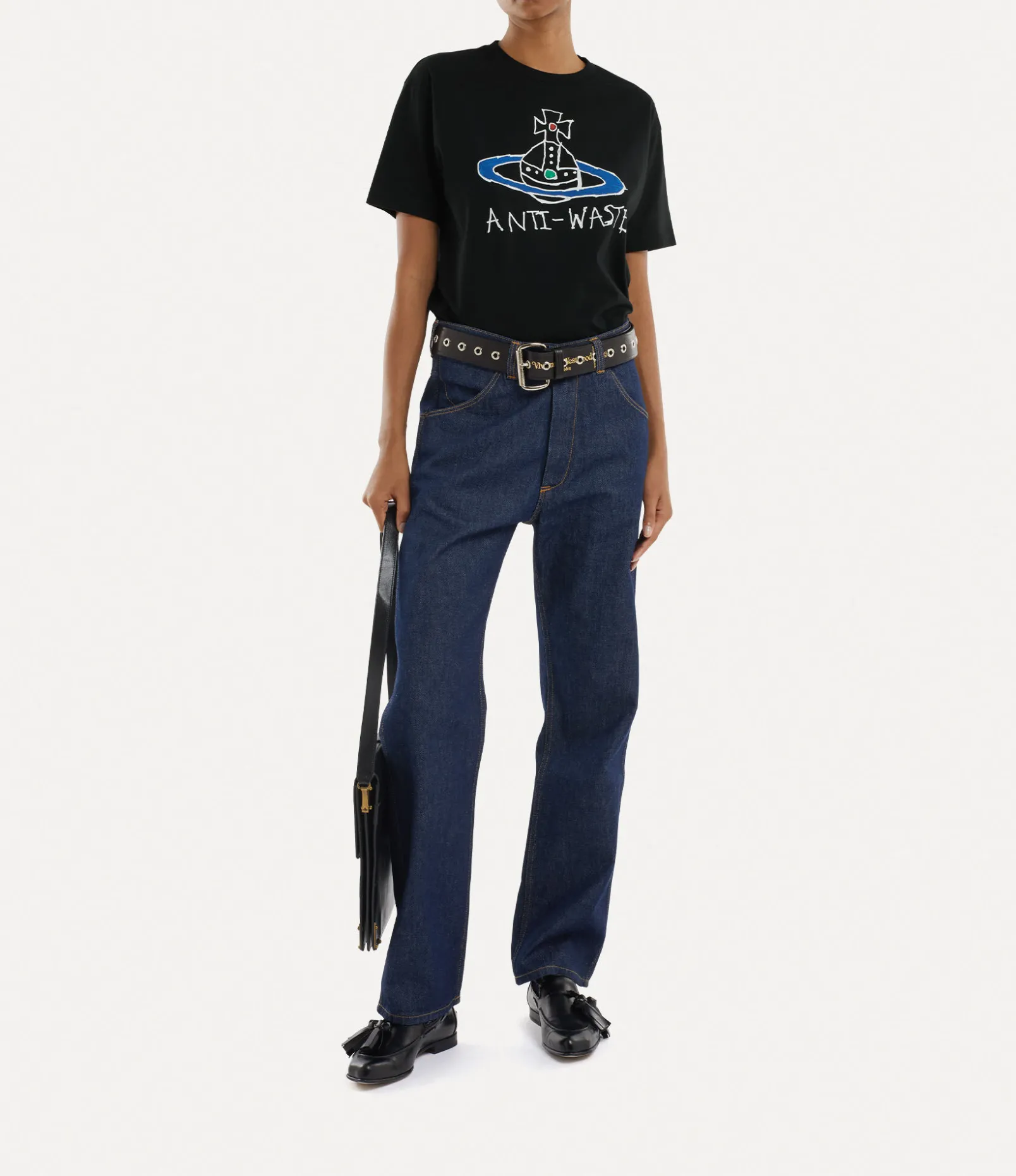 In collaboration with Revere the Residence, a dedicated charitable organisation, our Anti-Waste slogan has been reimagined by the talented London-based artist Sabrina Maalow. This signature artwork was first debuted in our Autumn-Winter 2017-18 collection, titled Ecotricity, which embodies Vivienne’s unwavering commitment to promoting conscious consumption and reducing waste.