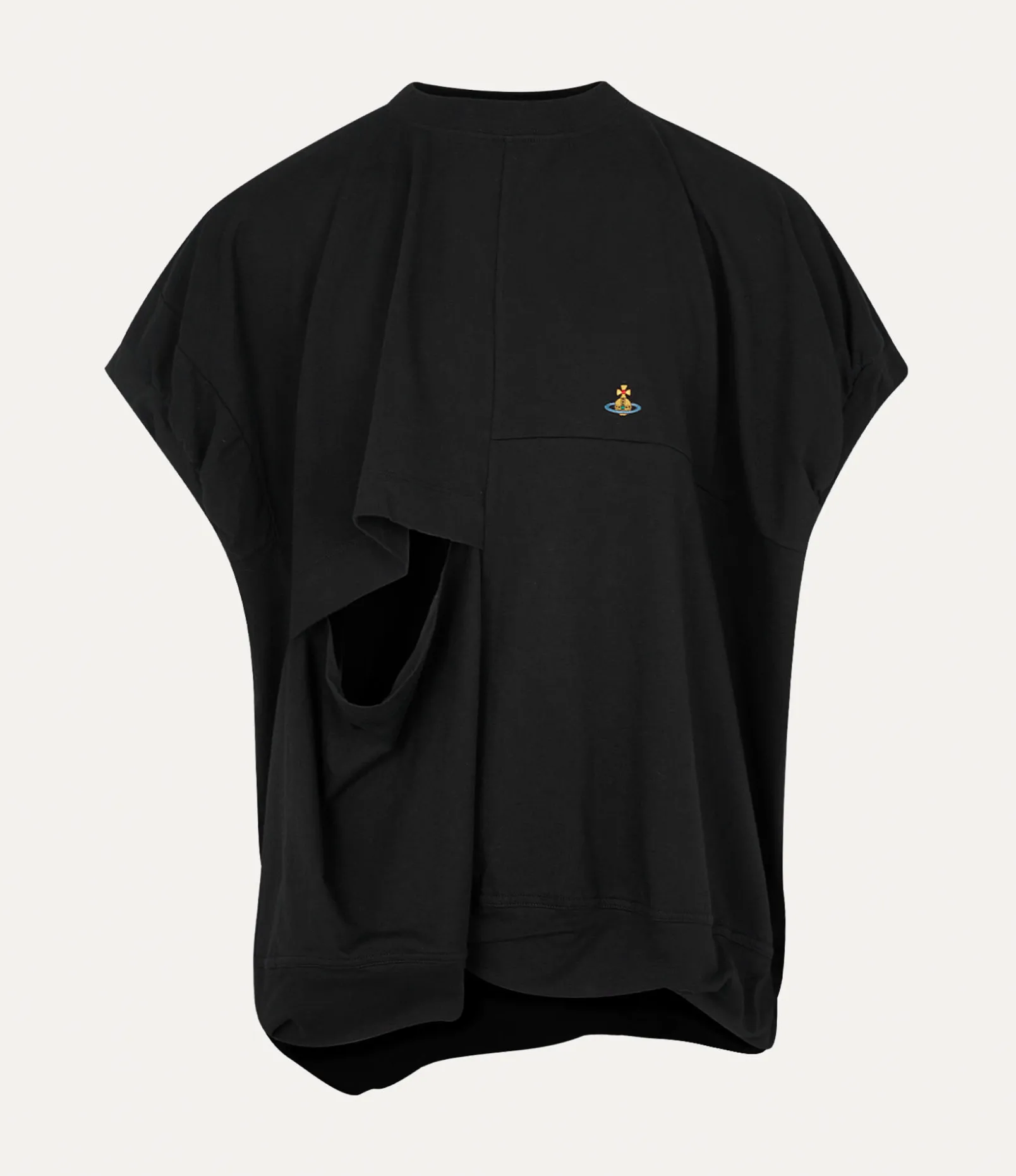 Our Twisted Sleeveless Dolly t-shirt with twisted silhouette is generously cut from cotton panels and features slash detailing, reminiscent of Vivienne Westwood’s ‘Cut, Slash and Pull’ collection for Spring-Summer 1990. The multicoloured embroidery on the left-hand side of the chest is inspired by our iconic orb logo, first appearing over 28 years ago in the Harris Tweed Autumn-Winter 1987-88 collection.