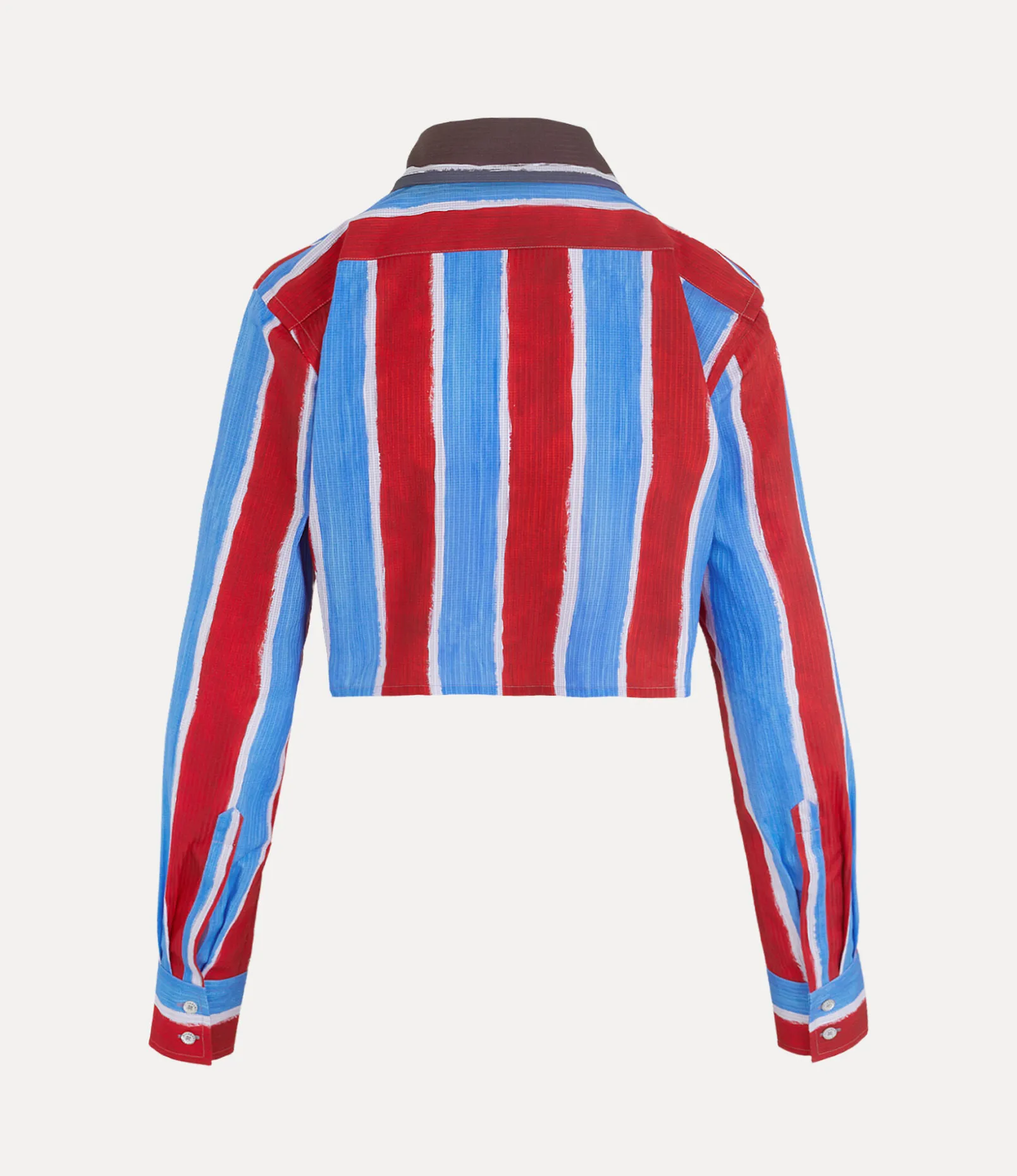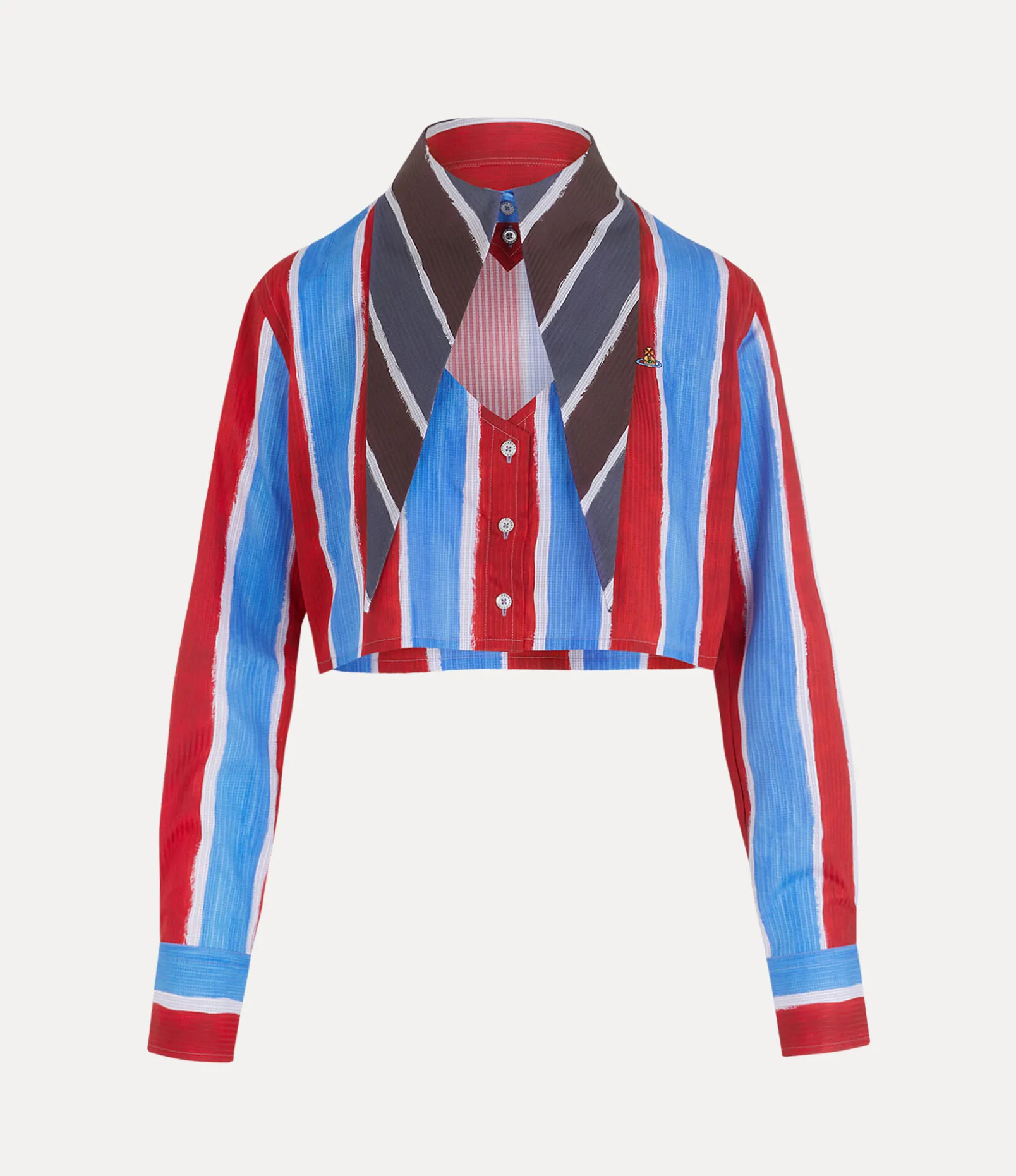 Our Cut-off Heart shirt features elements of Vivienne’s iconic heart tailoring system, highlighted by a heart-shaped detail at the neckline and an elongated raised collar. The piece adopts our all-over painted rough stripe motif, complete with a multicoloured embroidered orb on the left-hand side of the chest.