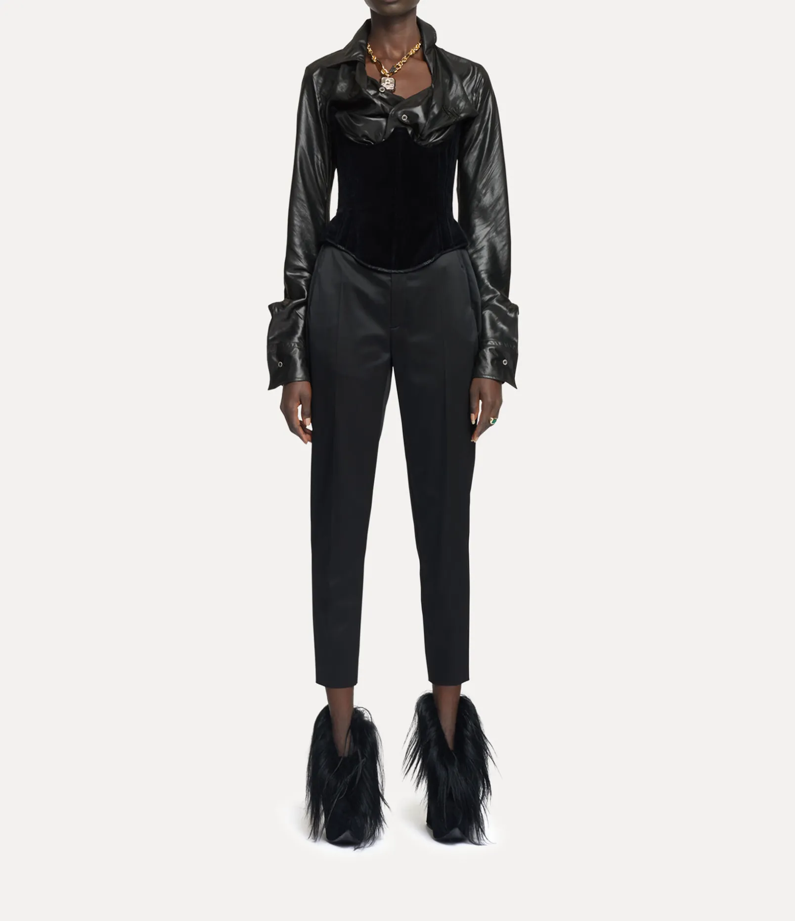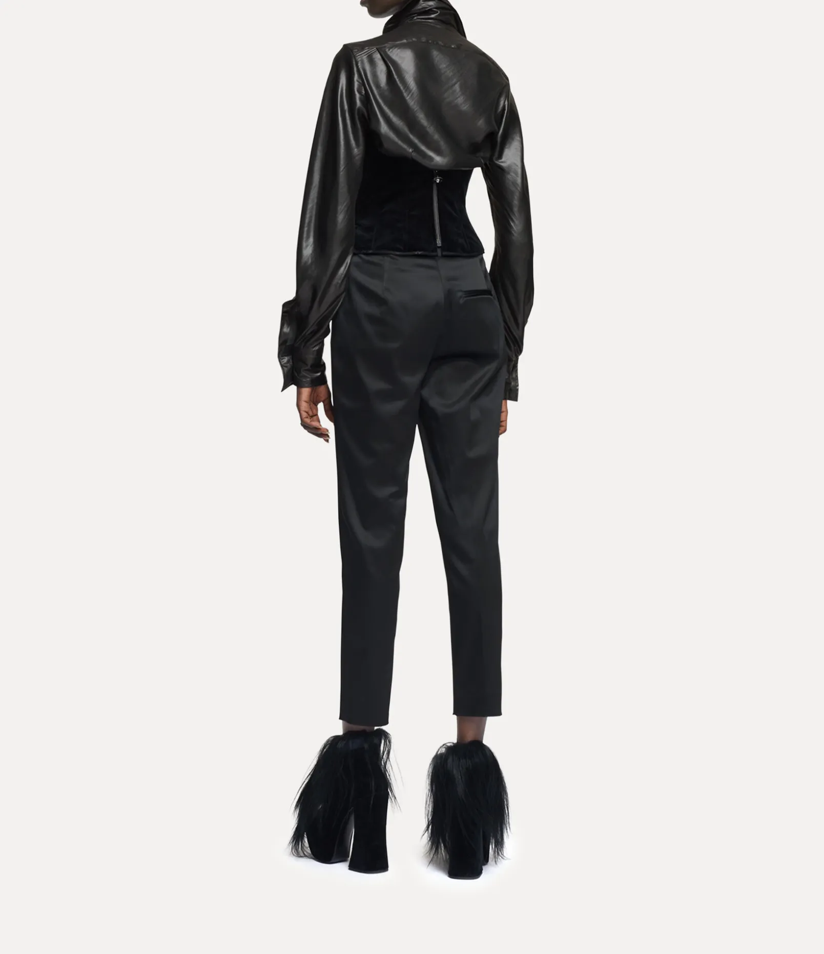 Our Drunken shirt revives elements of the ‘Alcoholic’ tailoring system, first introduced in the Autumn-Winter 1983-84 ‘Witches’ collection. Made from a chintz fabric which has been dyed for a glossy appearance, the design adopts an off-centre button placket with an asymmetrical hemline, complete with Mother of Pearl buttons.