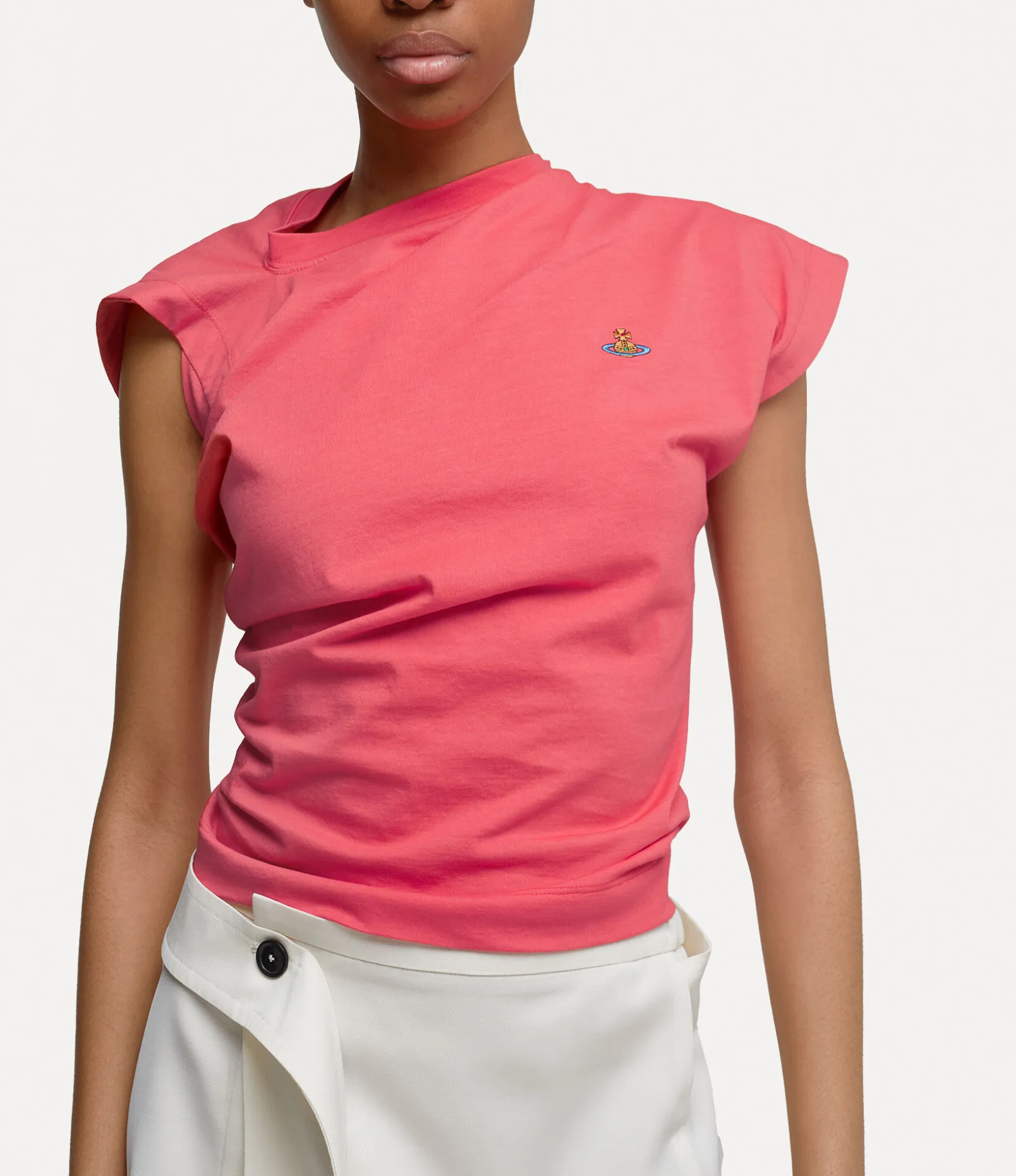 The house’s signature Hebo top has been updated this season, featuring a soft cotton finish and a multicoloured orb embroidered on the left-hand side of the chest – synonymous with Vivienne’s vision of launching tradition into the future. The silhouette incorporates Vivienne’s archival tailoring systems, complete with a slash-inspired neckline, drape details and twisted fabric at the back of the design.