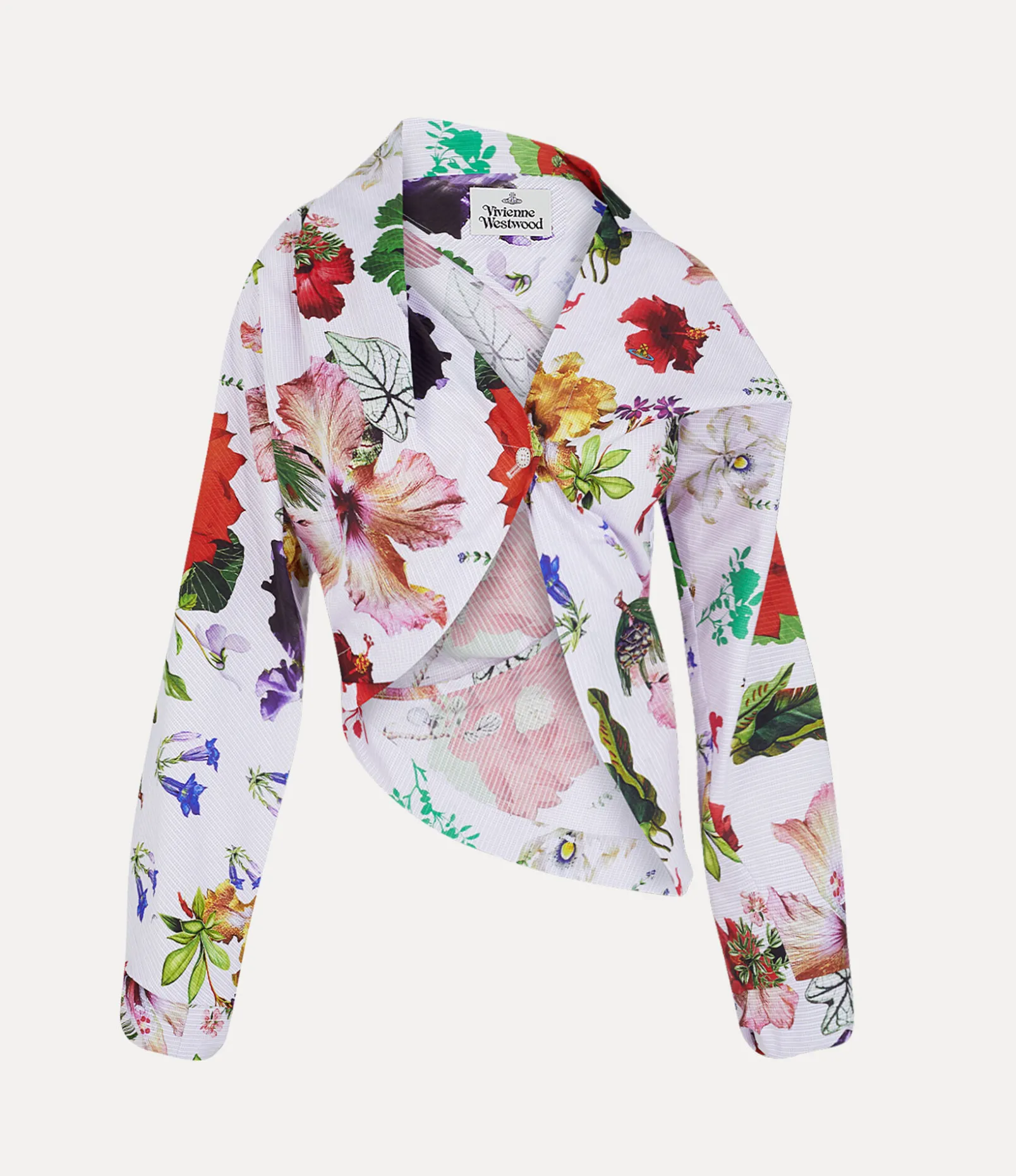 Our long-sleeve Natalia shirt features a cotton stripe motif, printed with this season’s floral artwork, comprised of vivid photographic flowers cut-out and collaged together. With twisted sleeves, the design incorporates an asymmetric neckline that fastens with a one-button closure.
