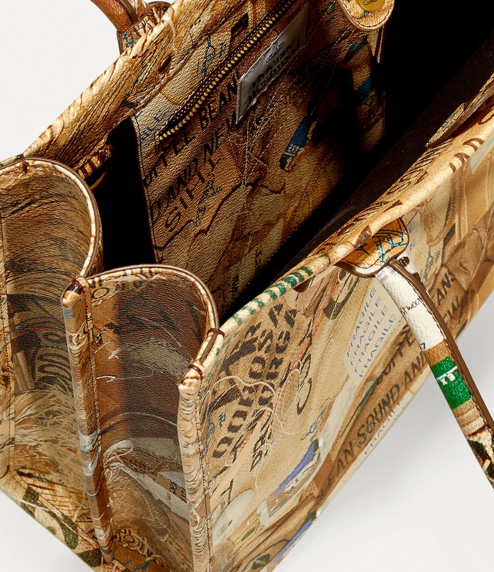 The Teddy tote bag in soft PU leather features a top-handle silhouette, complete with extendable gussets on either side of the design. The piece receives our archive ‘Rubbish’ motif, a collage of packaging and cardboard images – evoking the concept of upcycling newspapers by using them to wrap valuable ornaments when moving house.