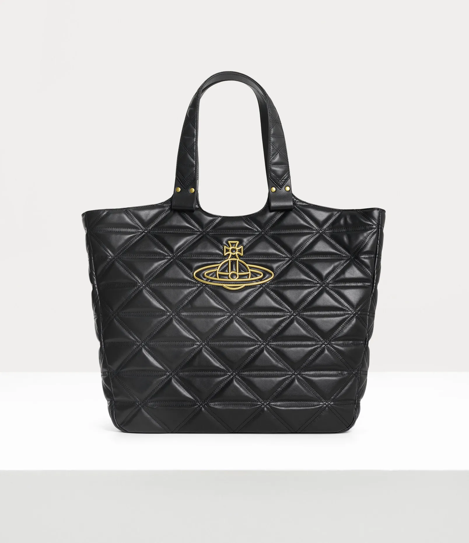 Our Talitha tote bag features our archive ‘Harlequin’ quilting, first introduced in the Vivienne Westwood Autumn-Winter 1989 ‘Voyage to Cythera’ collection. The piece borrows the ‘Baby Orb’ lining from our Spring-Summer 2023 range, finished with a brass-plated orb on the front panel – synonymous with Vivienne’s vision of launching tradition into the future.