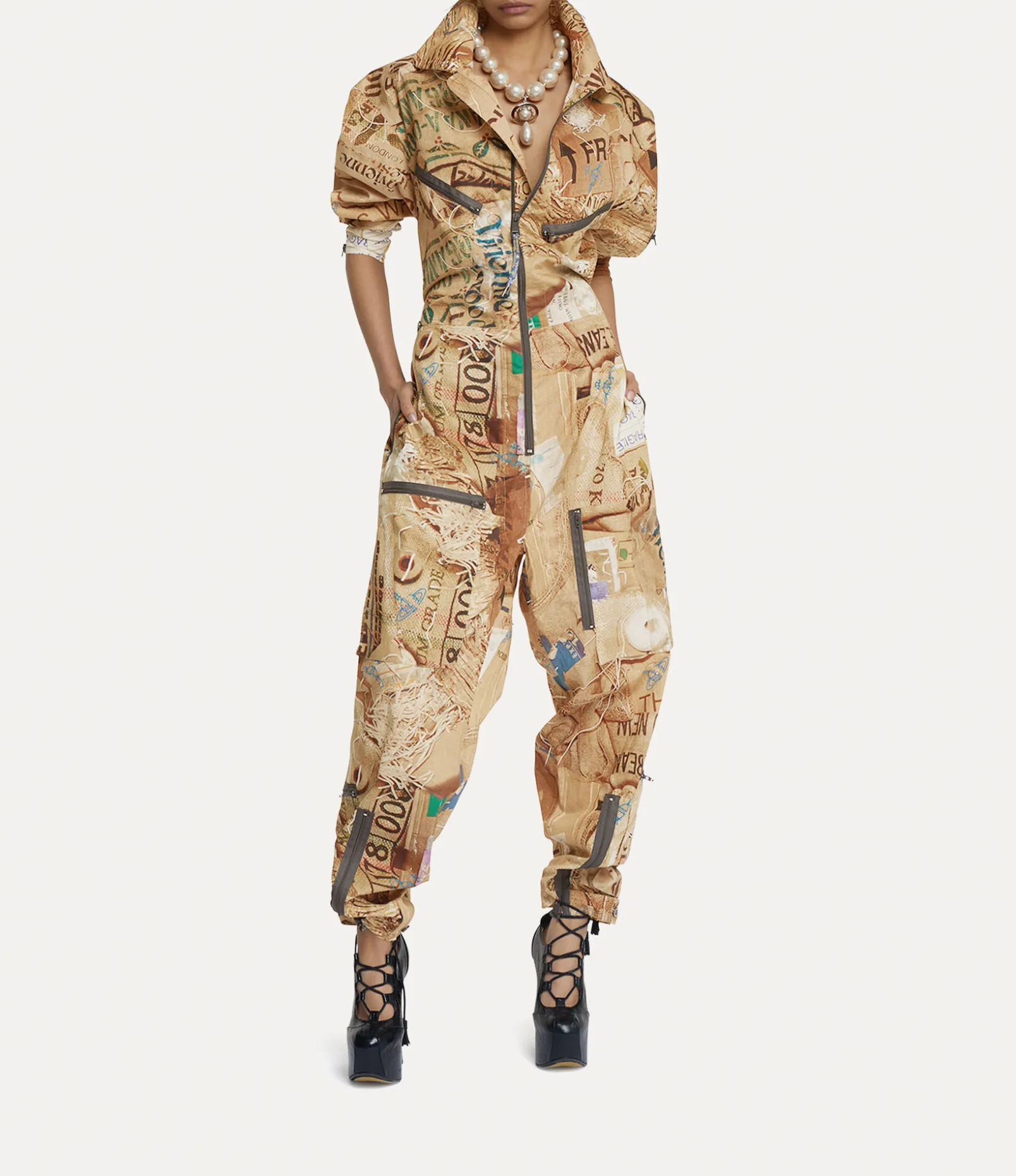 Our Joan jumpsuit was first seen in the Vivienne Westwood Autumn-Winter 2020-2021 collection. This season, the piece receives a central zip puller adorned with an orb-printed shoelace, complete with our archival ‘Rubbish’ motif, reminiscent of packaging materials and cardboard waste.