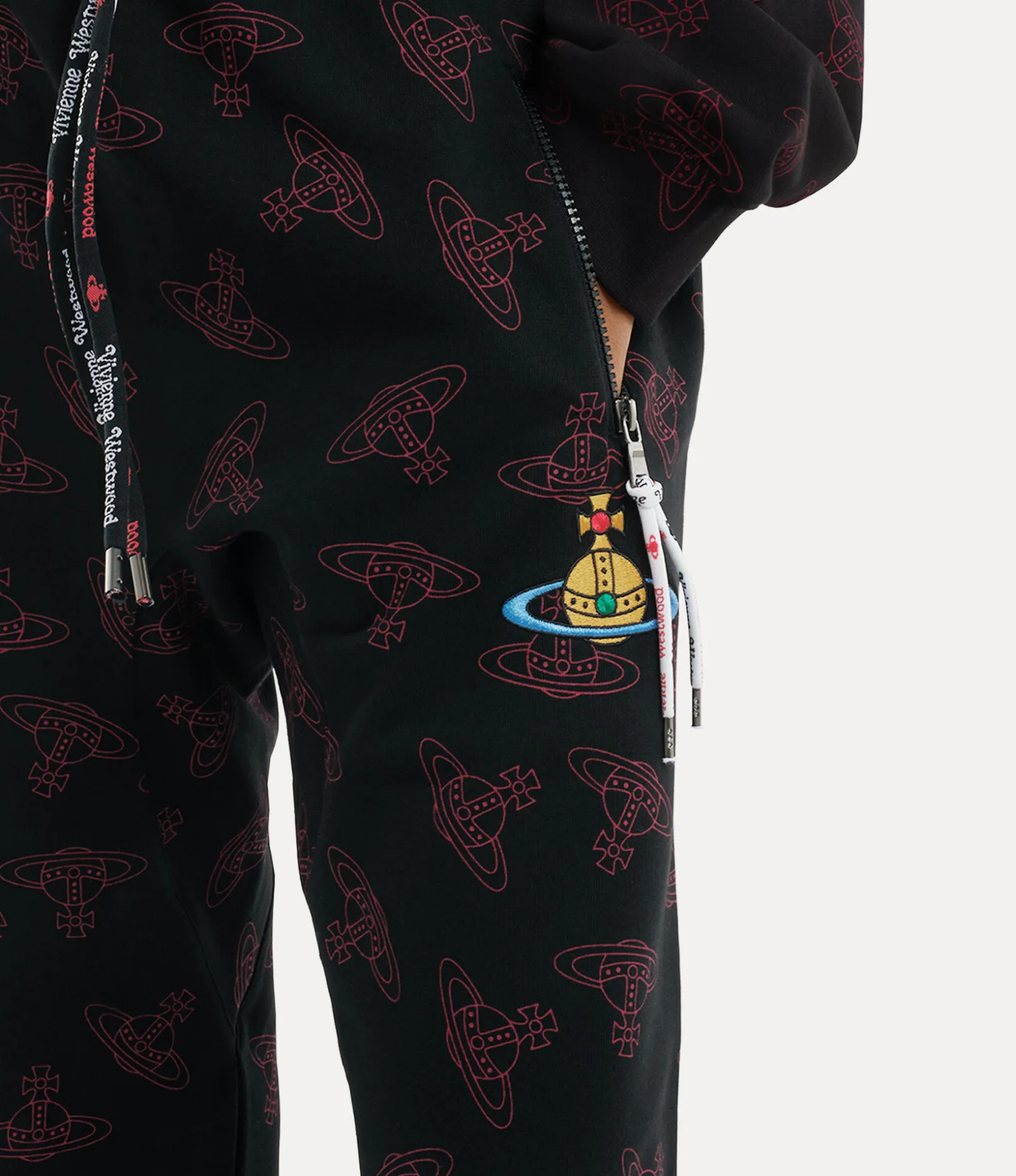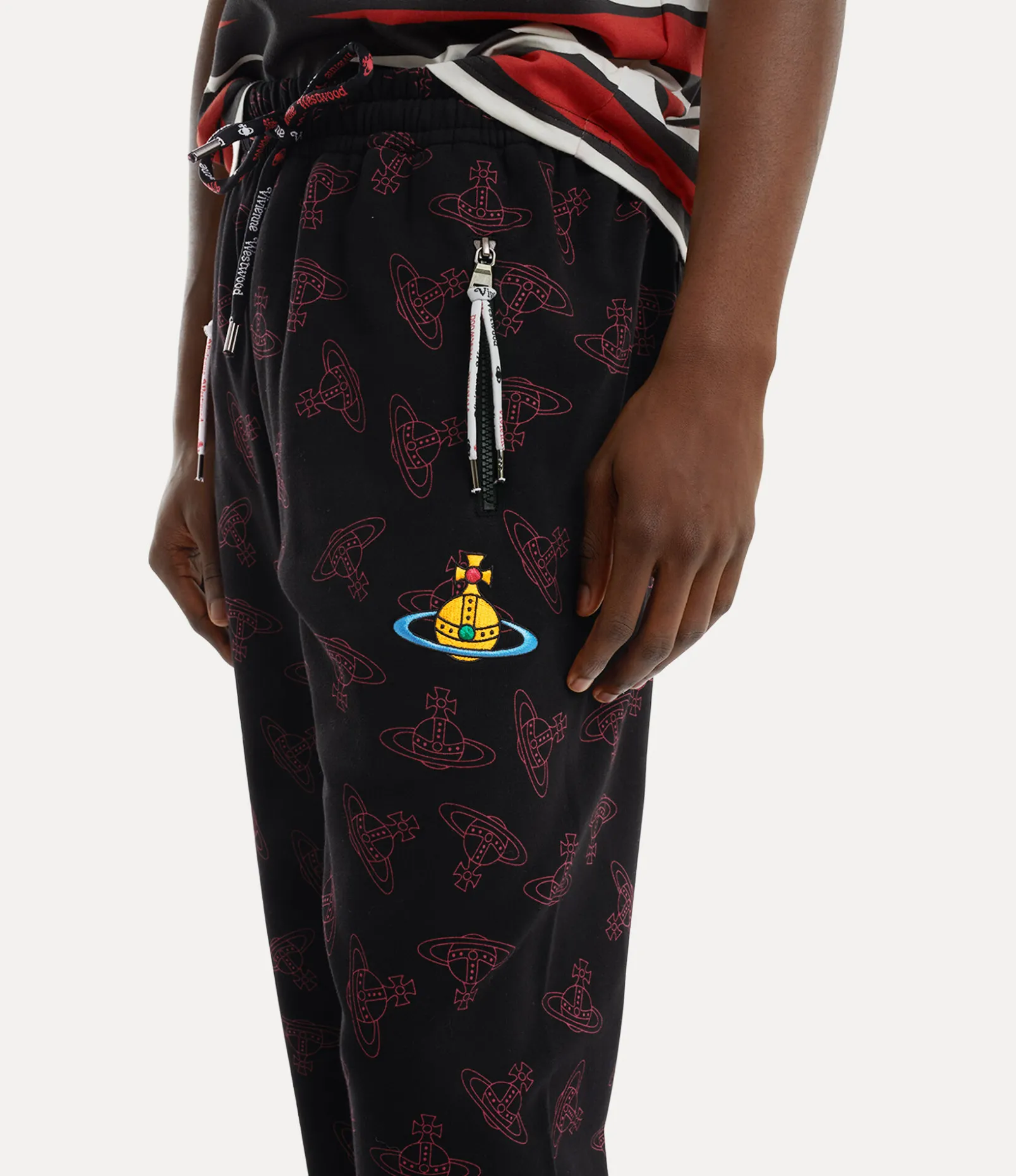 Our Football trousers take inspiration from football culture and receive a lowered crotch seam with shoelace fastenings, patterned with this season’s orb jacquard across the design. The piece features the houses vibrant multicoloured orb embroidery on the left-hand side, embodying Vivienne’s innovative blend of tradition and modernity.