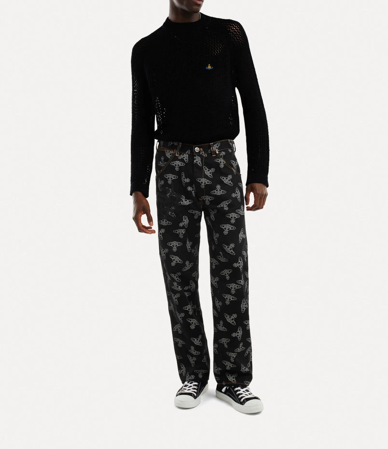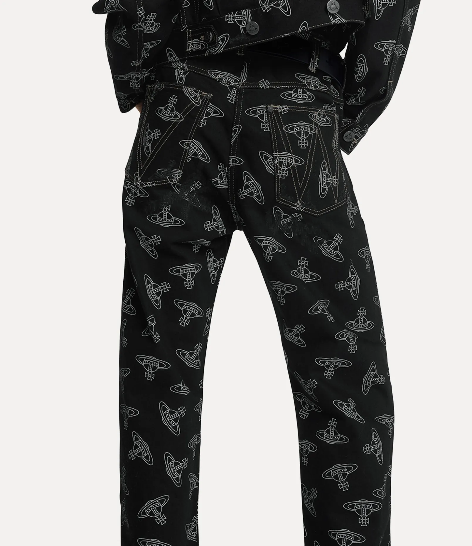 This season’s orb jacquard features across our straight-leg Ranch jeans, reviving the house’s classic ‘Line Orb’ motif – synonymous with Vivienne Westwood’s vision of taking tradition into the future. The piece is adorned with our archival ‘V’ and ‘W’ monogram topstitching on the rear pockets, fastening with orb-engraved metal buttons.