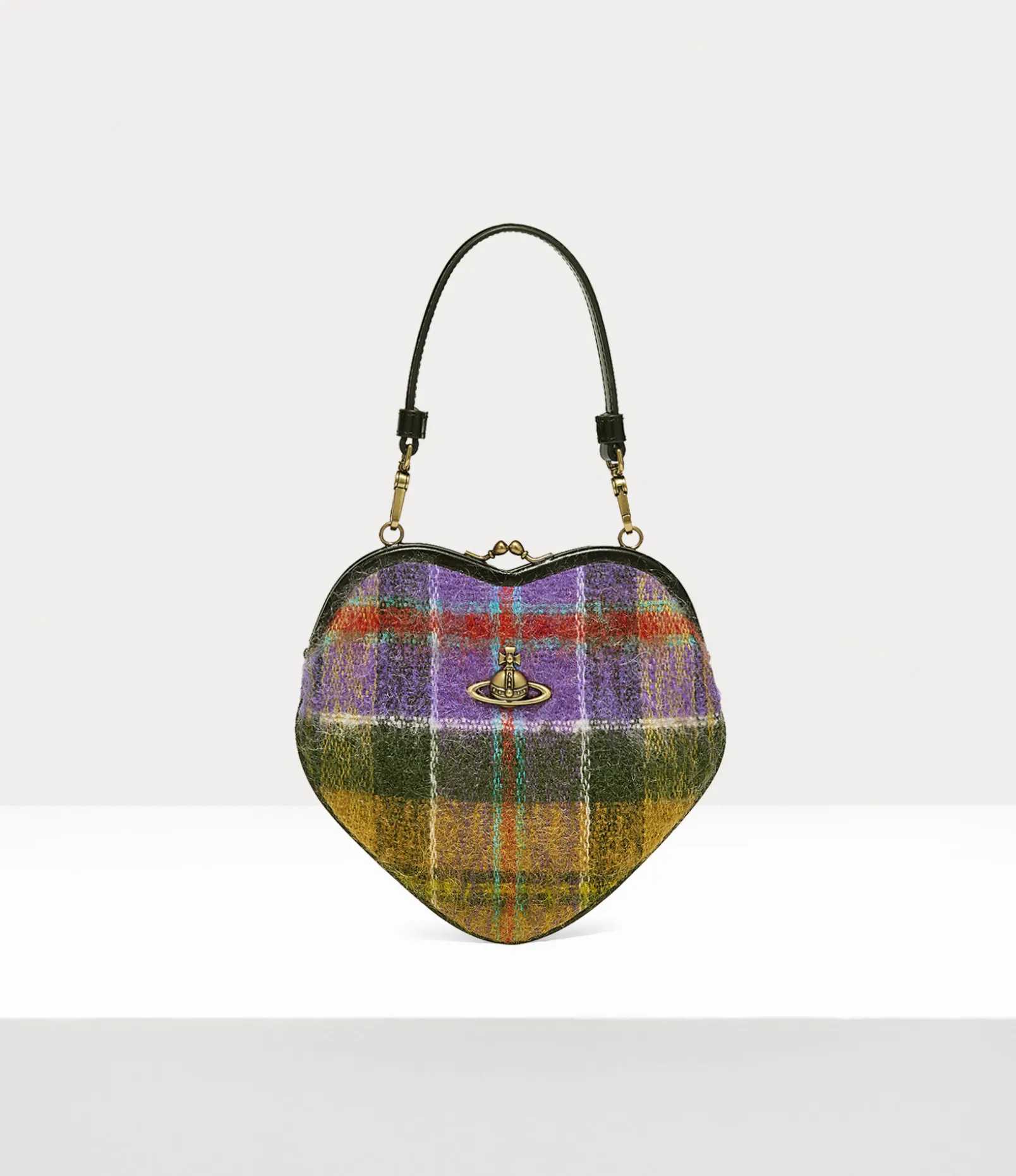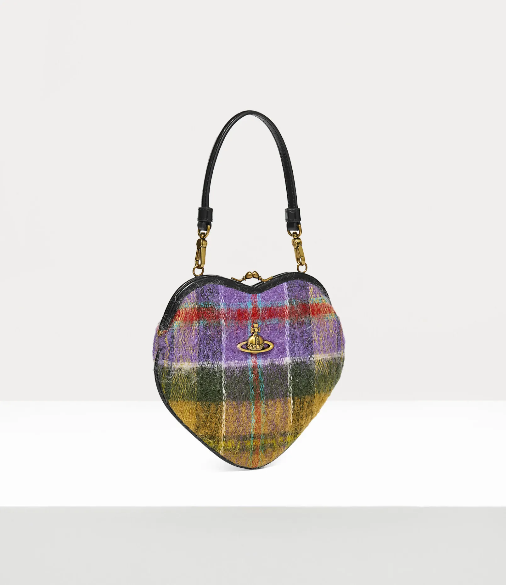 The Lochcarron of Scotland tartan motif, which emphasises the Neo-classical inspirations of the collection, can be found across the Vivienne Westwood Belle Heart Frame purse this season. The style receives a cotton ‘Broken Pinstripe’ interior lining, a unique twist on the traditional pinstripe, complete with a brass orb plaque on the front panel – synonymous with Vivienne’s vision of launching tradition into the future.
