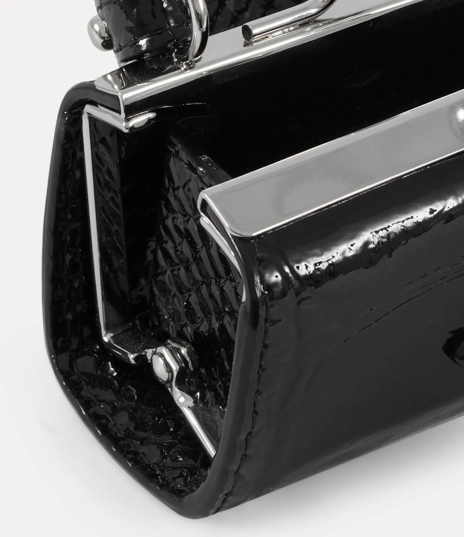 Our Doll bag features a patent leather finish, reminiscent of the liquid latex and rubberwear sold in our iconic Sex boutique. The miniature silhouette draws inspiration from toy doll bags, featuring an intricately engraved kiss lock closure and our dangle orb motif, symbolising Vivienne Westwood’s idea of taking tradition into the future.