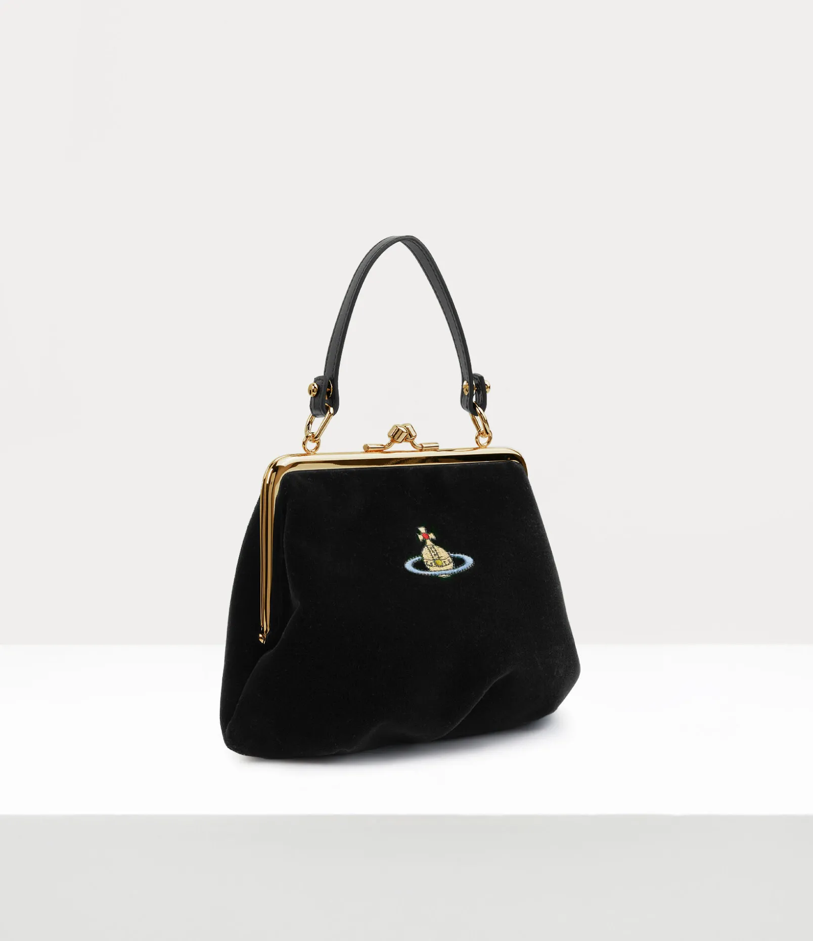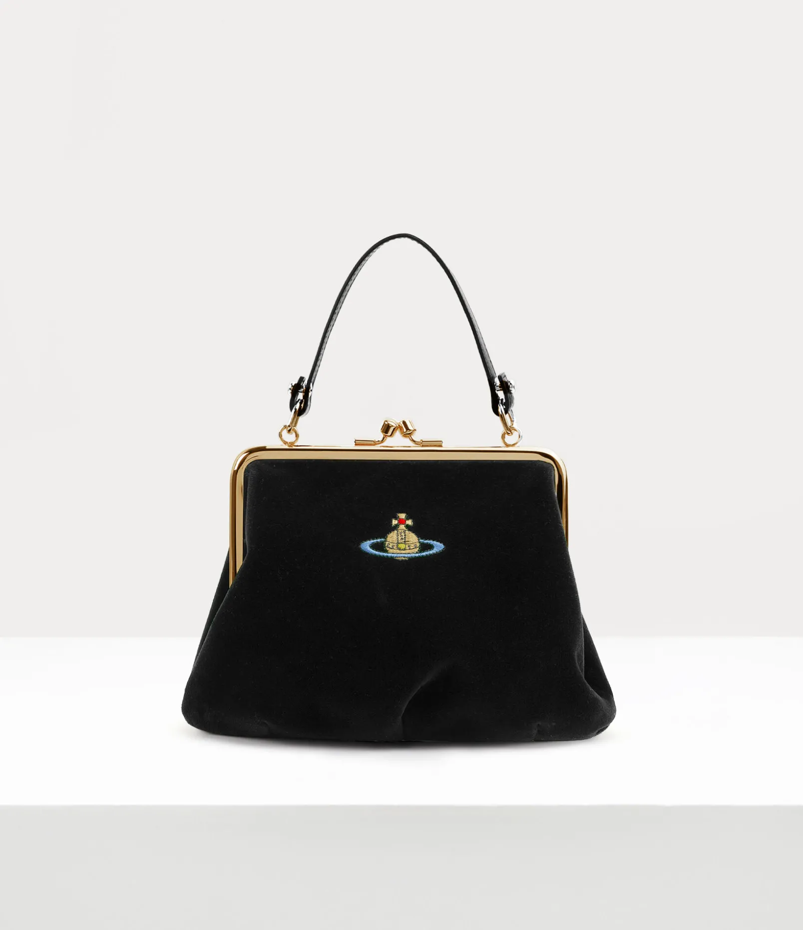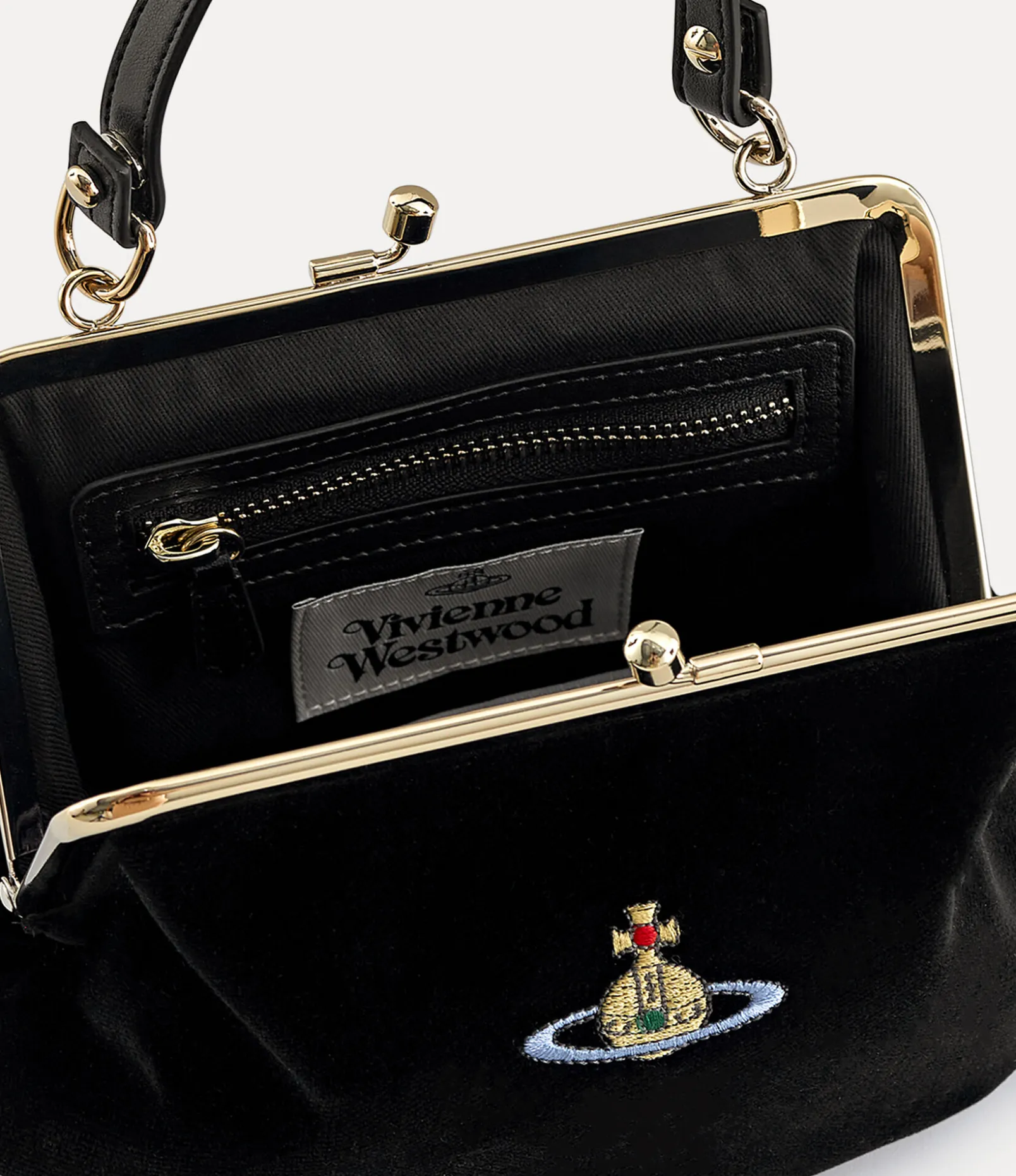 Our Granny Frame purse combines a vintage-inspired silhouette with a kiss-lock closure, reminiscent of early 20th-century antique coin purses. This piece receives a soft cotton velvet silhouette, complete with an embroidered orb on the front panel – embodying Vivienne Westwood’s innovative approach to blending heritage with modernity.