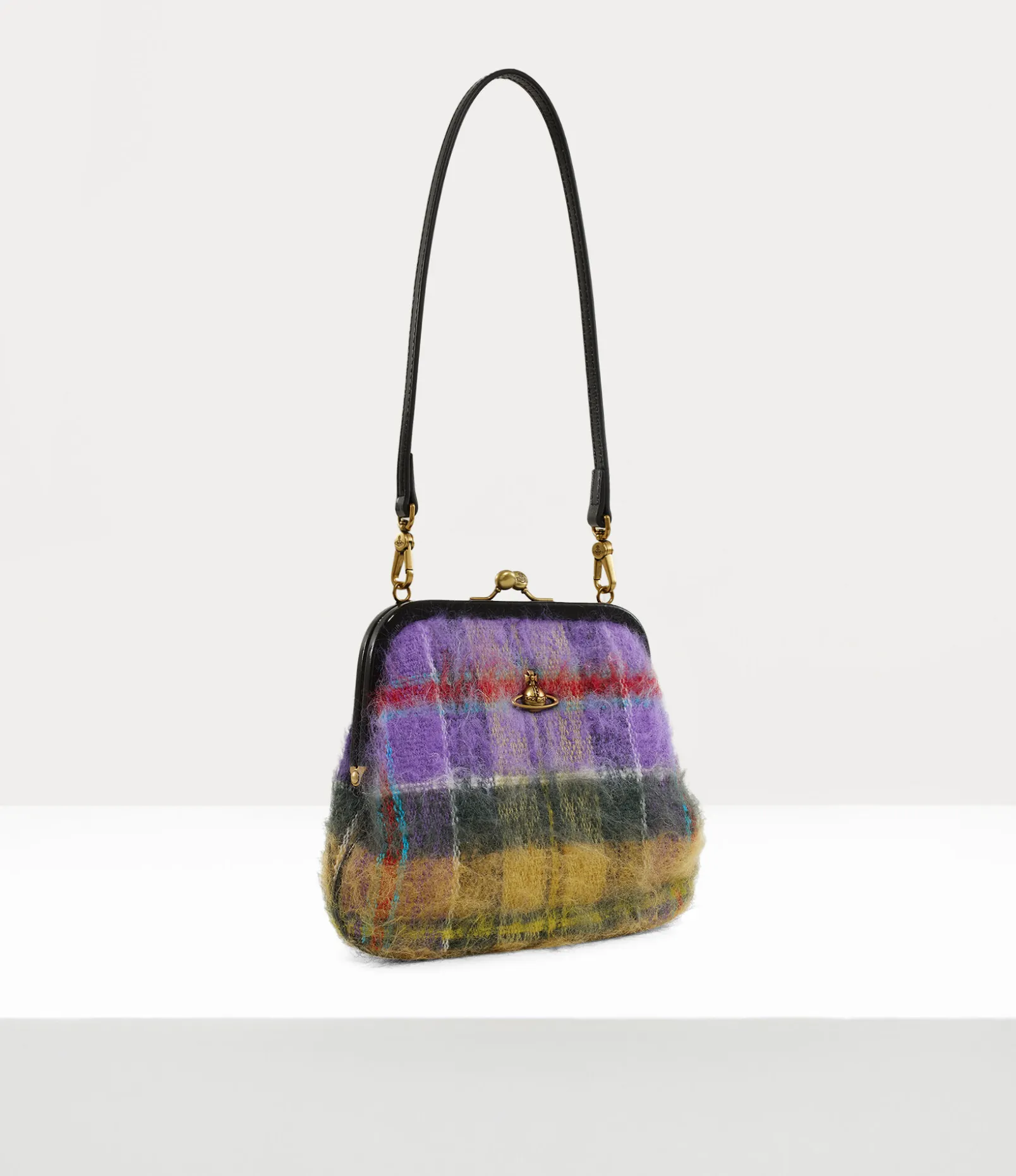 Named after Vivienne Westwood, this season’s Vivienne’s clutch features an intricate kiss-lock closure, reminiscent of early 20th-century antique coin purses, complete with antique gold plating. The piece receives a tartan mohair finish, capturing the essence of Scotland’s rugged landscape, created using a brushed effect technique.