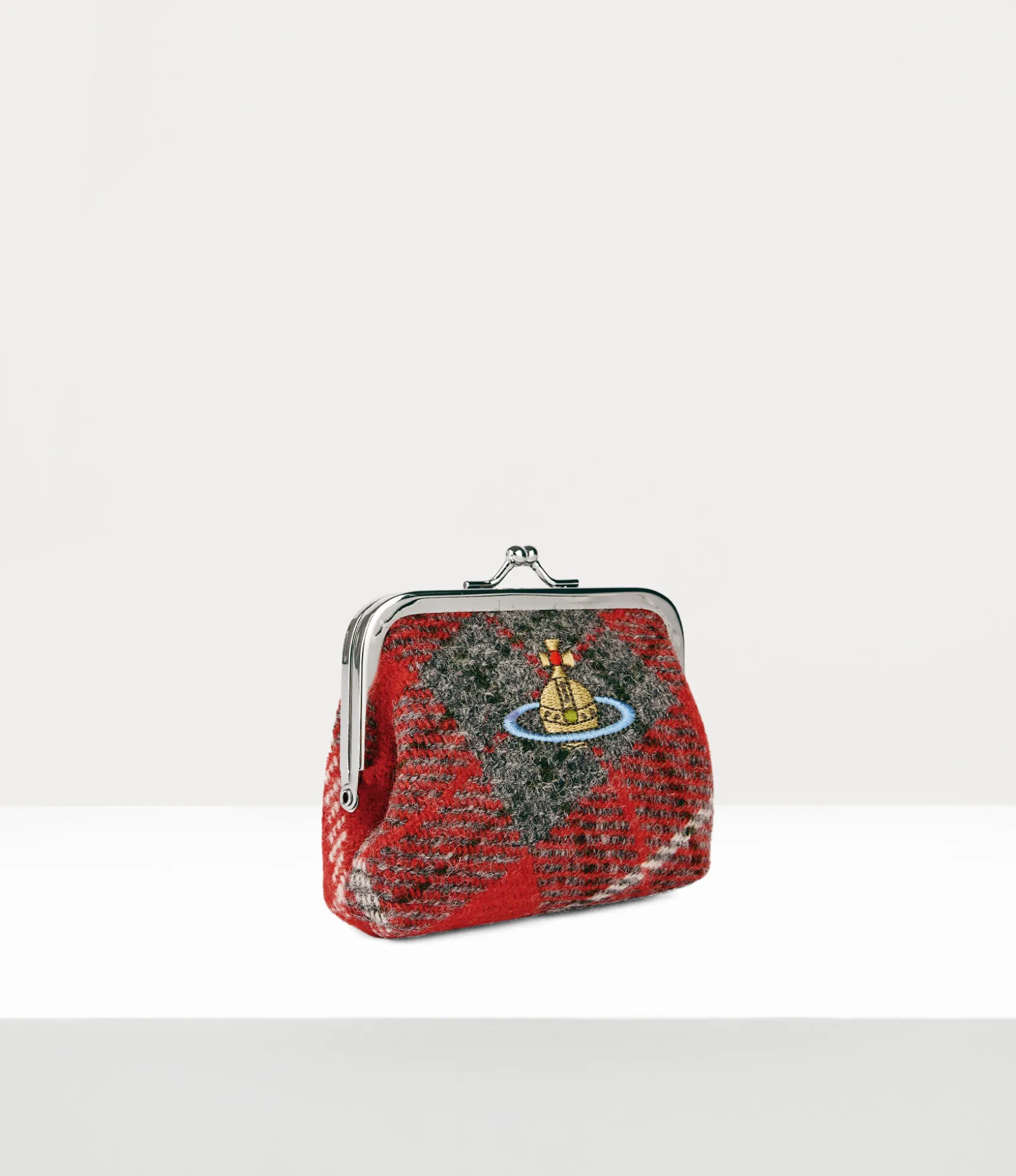 Our Frame Coin purse features a vintage-inspired silhouette, complete with a kiss-lock closure, reminiscent of early 20th-century antique coin purses. The piece receives Harris Tweed tartan pattern, sourced from Lochcarron of Scotland, complete with an embroidered orb on the front panel – alluding to Vivienne’s vision of taking tradition into the future.