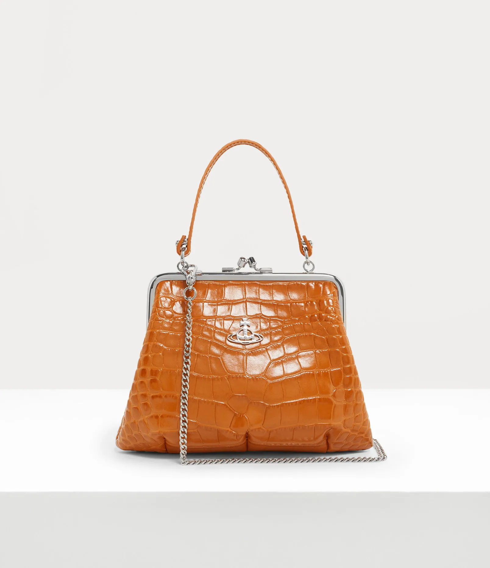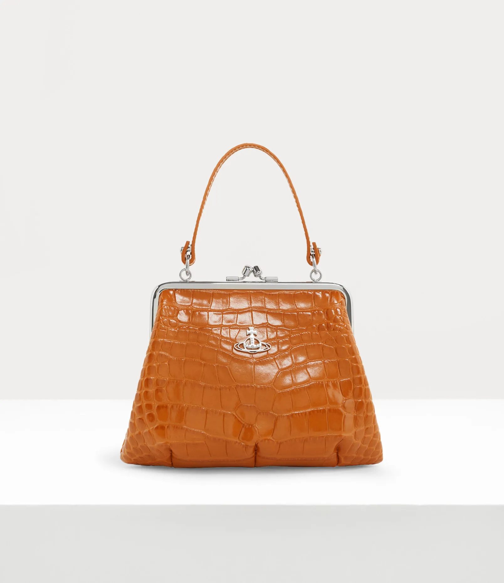 Our Granny Frame purse features a vintage-inspired silhouette and a kiss-lock closure, recalling antique coin purses from the early 20th century. The piece receives a croc-embossed finish, complete with our classic line orb motif – synonymous with Vivienne’s vision for taking tradition into the future.